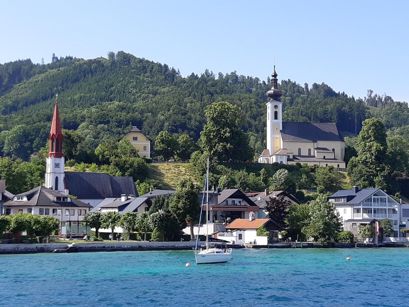 Nach einer Stärkung in einem schattigen Restaurant am Mondsee und der nochmaligen Erkenntnis, dass man am Ende des Mondsees mit Ruderbooten nicht anlegen kann, weil alle Strände in privater Hand sind, ging es zurück nach Unterach am Attersee und von dort mit dem Schiff über den See zurück zum Ort Attersee. Inzwischen hatte sich ein Gewitter zusammengebraut, Sturm kam auf und kräftiger Regen. Die Sturmlampen waren schon in Aktion getreten. Der See tobte. An Rudern wäre an diesem Tag auch ohne die Bootsschäden gar nicht zu denken gewesen, weil der Wind den ganzen Tag lang kräftig geblasen hatte, bevor er sich in einen Sturm entlud. Alle Ruderinnen waren froh, im Schiff und nicht im Ruderboot zu sitzen. Als der Gewittersturm vorbei war, schien wieder die Sonne und setzte die beiden Kirchen von Attersee ins rechte Licht: die Pfarr- und Wallfahrtskirche "Maria Attersee" (oben) und die Martinskirche (unten: seit 1813 evangelische Kirche).