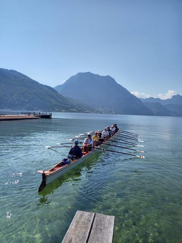 Am dritten Tag auf dem Mondsee war der eine C-Vierer wegen kleinerer Reparaturarbeiten aus dem Verkehr gezogen, so dass uns nur ein Achter zur Verfügung stand. Zur Überraschung aller war dieses ein Rennachter und für einige eine neue Erfahrung und Herausforderung. Die Seerunde fiel aus verständlichen Gründen etwas kürzer aus.