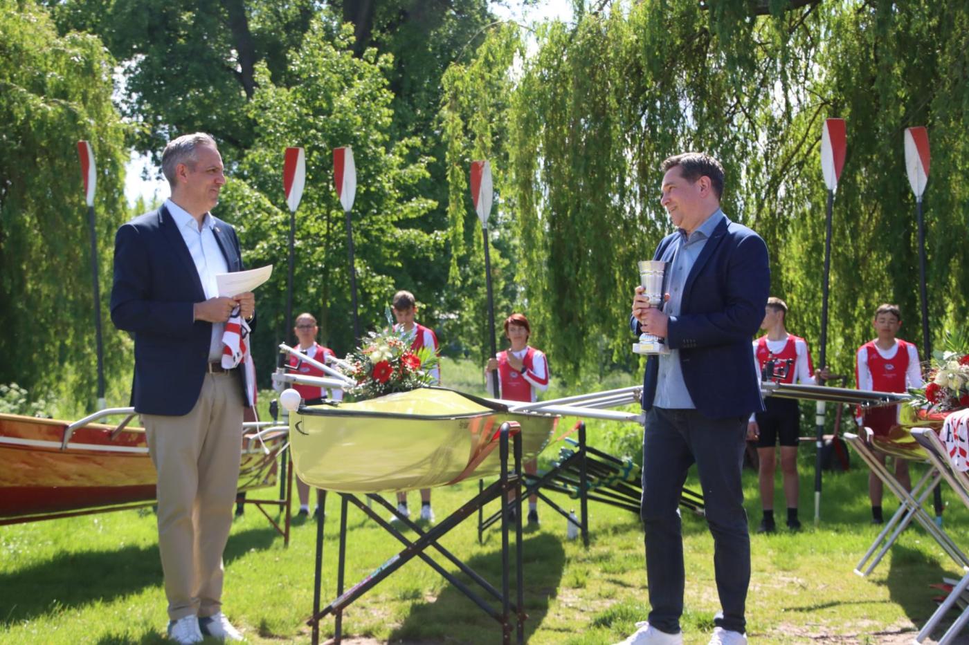 Unter den getauften Booten waren auch drei Anschaffungen der Rehbein-Schule. Einen breiten Gig-Vierer zur Ruder-Ausbildung taufte Vanessa Pape von der KRS auf den Namen „Schwimmendes Klassenzimmer“ in Anlehnung an das Buch von Erich Kästner. In dessen „Das fliegende Klassenzimmer“ geht es um Freundschaft, Solidarität und der Bedeutung von Zusammenhalt. „Die Geschichte zeigt, wie wichtig es ist, füreinander da zu sein, sich gegenseitig zu unterstützen und gemeinsam Hindernisse zu überwinden. Allesamt Themen, die auch im Mannschaftssport unabdingbar sind“, sagte Kliem.