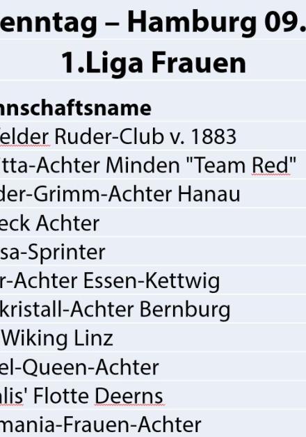 In der Frauen-Bundesliga übernimmt der Crefelder RC nach dem Renntagsieg in Hamburg punktgleich mit dem „Melitta-Achter Minden Team Red“ auf Grund der besseren Einzelplatzierungen wieder die Tabellenführung. Das Team aus der Seidenweberstadt siegte im Finale gegen den Brüder Grimm-Achter aus Hanau. Der „Melitta-Achter Minden Team Red“ sicherte sich Bronze vor der heimischen Crew der Hansa-Sprinter aus Hamburg, welcher die „goldene Ananas“ gewann.