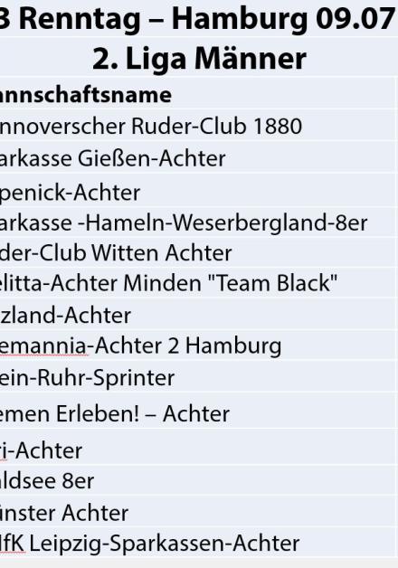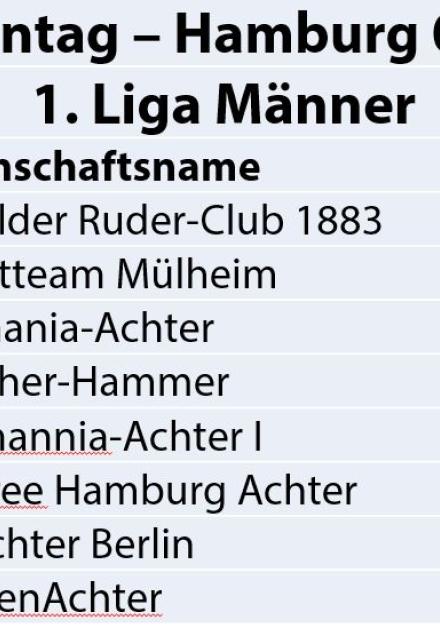 Für die Hamburger Lokalmatadoren vom Allemannia-Achter I blieb in der Eliteliga die „goldene Ananas“. Die Plätze auf dem Podium in der 1. Liga der Männer erkämpften sich das „Sprintteam Mülheim“ als Drittplatzierter, der „Germania-Achter“ aus Frankfurt auf dem Silberrang und das wiederum siegreiche Team des Crefelder RC, die nach einem mehr als souveränen und dominanten Renntag die Tabelle nun deutlich mit 6 Punkten anführen.