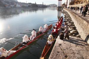 „Alle Jahre wieder…“, bringen acht „Ruder-Nikoläuse“ des Passauer Rudervereins am Sonntagnachmittag vor Nikolaus zusammen mit ihrer als Engel verkleideten Steuerfrau Margarete Bernhardt, viele tolle Geschenke ins Lukas-Kern-Kinderheim. Den 19 Heimkindern übergaben sie kleine vorweihnachtliche Geschenkpäckchen. Süße Leckereien, Nüsse, Äpfel und Orangen waren in den reichgefüllten Tüten, aber auch ein kleines Taschengeld in bar, damit sich die Kinder und Jugendlichen einen eigenen kleinen Wunsch erfüllen können. Bereits zum achten Mal wurde die Benefizaktion zum Nikolausfest von den „Legos“ aus dem Passauer Ruderverein gestartet. Neu war, dass in diesem Jahr auch ein gesteuerter „Engerl-Vierer“ den Nikolausachter begleitete. Insgesamt wurden Geschenke im Wert von ca. 500 Euro an die Kinder verteilt. Gespendet wurden diese zum Großteil von den „Engerln und Nikoläusen“, aber auch vom Verein und einigen anderen aktiven Mitgliedern. Wie gewohnt wurde für die Übergabe von den Sportlern des Rudervereins der Wasserweg über Donau und Inn ausgewählt.