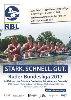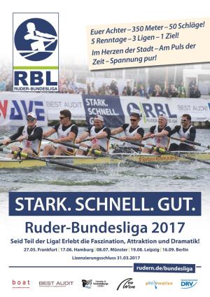Die Planungen für die neue Saison der Ruder-Bundesliga laufen auf Hochtouren. Nach intensiven und konstruktiven Gesprächen steht der Fahrplan für die stärkste Sprint-Liga der Welt fest. Nach einer phantastischen Saison 2016 mit vielen unvergesslichen Momenten, setzt RBL-Manager Boris Orlowski in der kommenden, mittlerweile 9. Saison erneut auf die Standorte Frankfurt, Hamburg, Münster, Leipzig und Berlin. Im Herzen der Städte werden ab Ende Mai hoffentlich wieder über 40 Sprintachter um die Tagessiege und Tabellenpunkte sprinten. Das Publikum darf sich auf spannende Schlagzahlschlachten mit Millimeterentscheidungen freuen. Das Musik- und Moderationskonzept, sowie das „Live-Streaming“ wird wieder viele neue Fans mit Gänsehautgefühl für die Ruder-Bundesliga und den Rudersport begeistern.