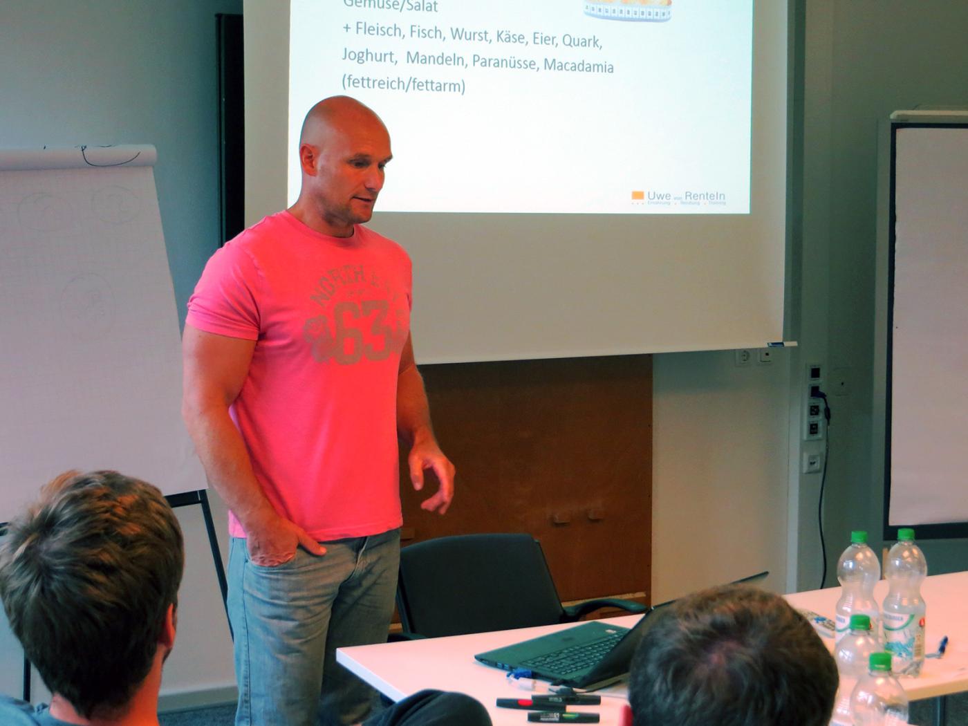 Den ersten Präsenzblock starteten wir mit den Themen Krafttraining, Ernährung, Zielgerechtes Rudermaterial, Sportmedizin und Sportpsychologie. Das Thema Krafttraining übernahm Martin Zawieja und hinterließ bei einigen mit seinen praktischen Übungen bleibenden Eindruck. Uwe von Renteln übernahm den Part der Ernährung, Marc Swienty das zielgerechte Rudermaterial, Dr. Ulrich Kau brachte uns noch einmal die Sportmedizin nahe und Wencke Schwarz übernahm den Part der Sportpsychologie bevor uns Andreas mit einer Hausaufgabe in die Heimat schickte.