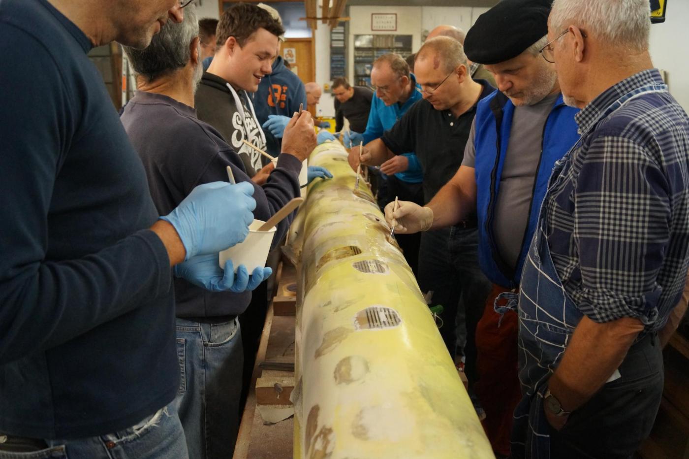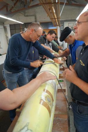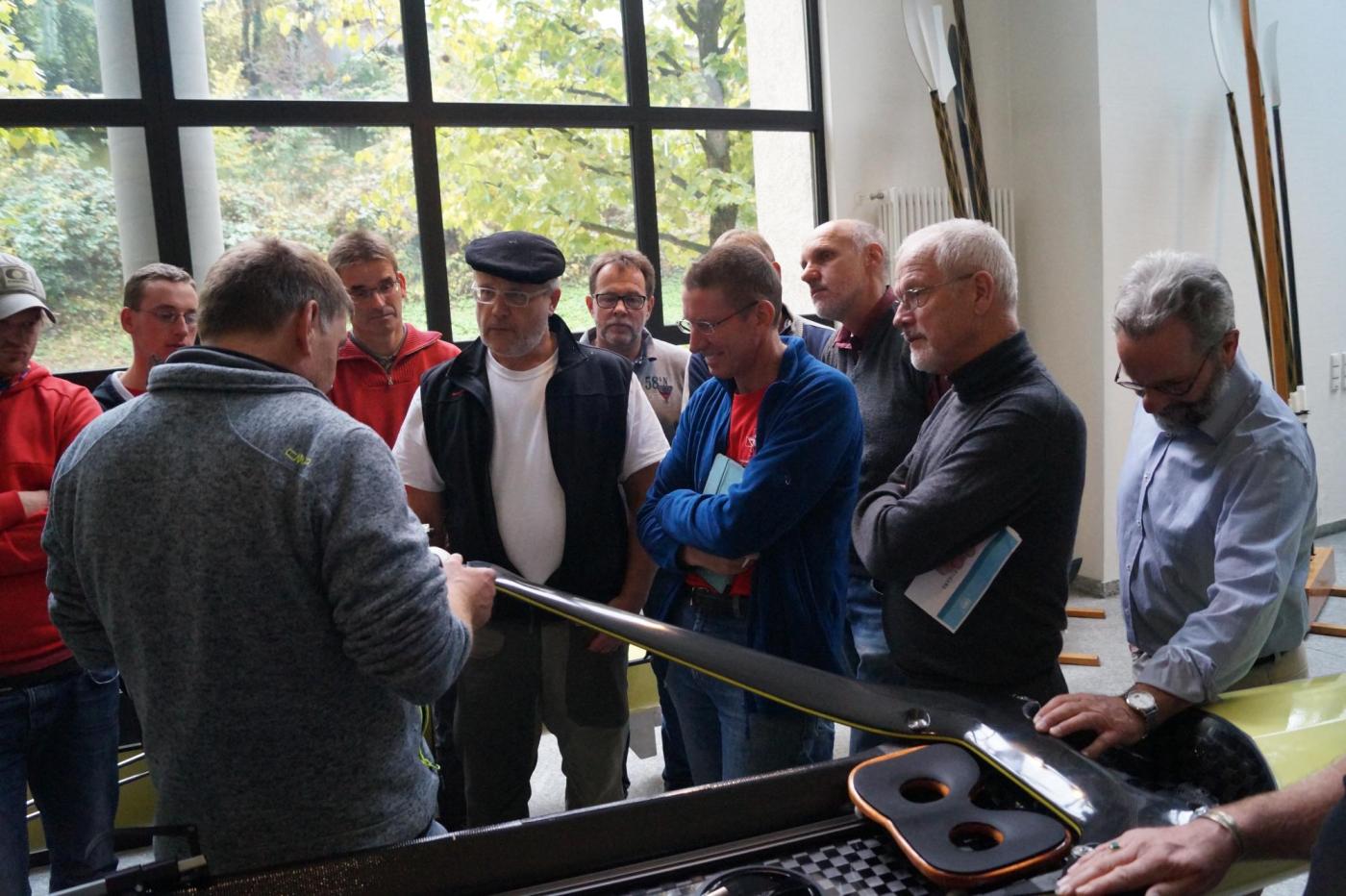 Erster Programmpunkt war die Begrüßung durch Helmut Empacher mit anschließender Führung durch die Produktionshallen der Werft. Dort konnten sich die Teilnehmer einen Einblick in die komplexe Herstellung der Hochleistungsboote verschaffen. Im Anschluss ging es in der alten Holzbootwerft auf der anderen Seite des Neckars weiter mit der Einführung in die verschiedenen Materialien, Werkzeuge und Utensilien, die für die folgenden Tage, sowie der späteren Anwendung des Gelernten, wichtig sind. Alle praktischen Teile des Lehrgangs übernahm Meister Rolf Winterhoff. Noch am selben Tag wurden Reparaturen an Holzbooten besprochen sowie das Überspannen des Luftkastens geübt.