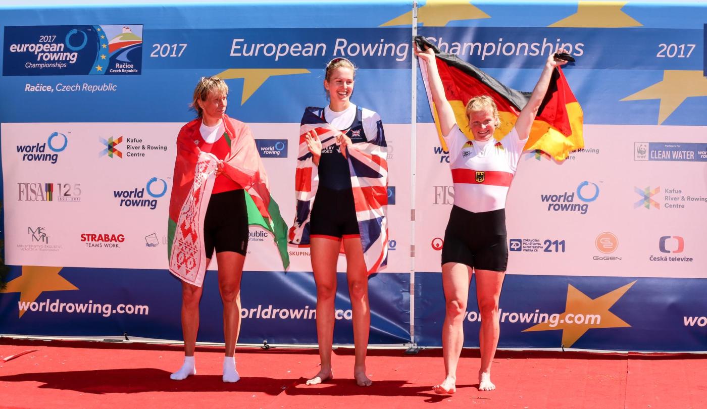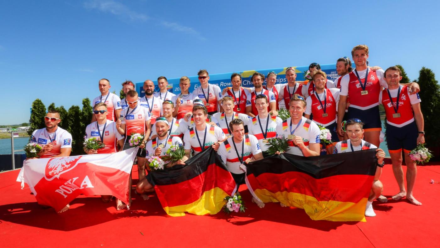 Bei den Europameisterschaften 2017 im tschechischen Racice nahe Prag gewann die zum Teil neuformierte Mannschaft des Deutschen Ruderverbandes heute bei sommerlichen Temperaturen und wechselhaften Windbedingungen die Goldmedaille im Männer-Achter mit Steuermann und im Frauen-Doppelvierer. Die Bronzemedaille im Frauen-Einer errang Annekatrin Thiele. Vierte Plätze belegten der Frauen- und der Männer-Doppelzweier. Tim-Ole Naske fuhr im Männer-Einer auf Platz 5, wie auch der Leichtgewichts-Männer-Doppelzweier. Einen sechsten Platz belegte Leonie Pieper im Leichtgewichts-Frauen-Einer. Der DRV-Vorsitzende, Siegfried Kaidel, zeigte sich zu diesem Saisonzeitpunkt zufrieden mit dem Ergebnis: „Es ist eine gute Basis für die weitere Entwicklung der Mannschaften, die sich jetzt auch erstmal teilweise weiter finden müssen.“