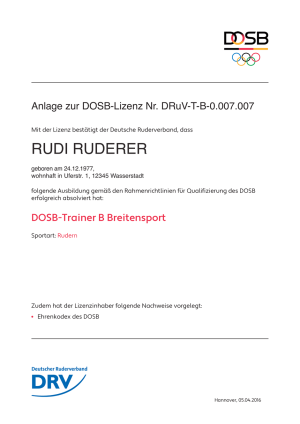 Die Lizenzen haben ein neues Format. Der DRV druckt die Lizenzen im Format DIN A4 doppelseitig aus und versendet sie an die Lizenzinhaber oder zum Beispiel an die Landeslehrrefrenten der Landesruderverbände für Trainer C-Ausbildungen, je nach vorheriger Absprache. Ein PDF-Versand per E-Mail an die Lizenzinhaber ist ergänzend möglich.