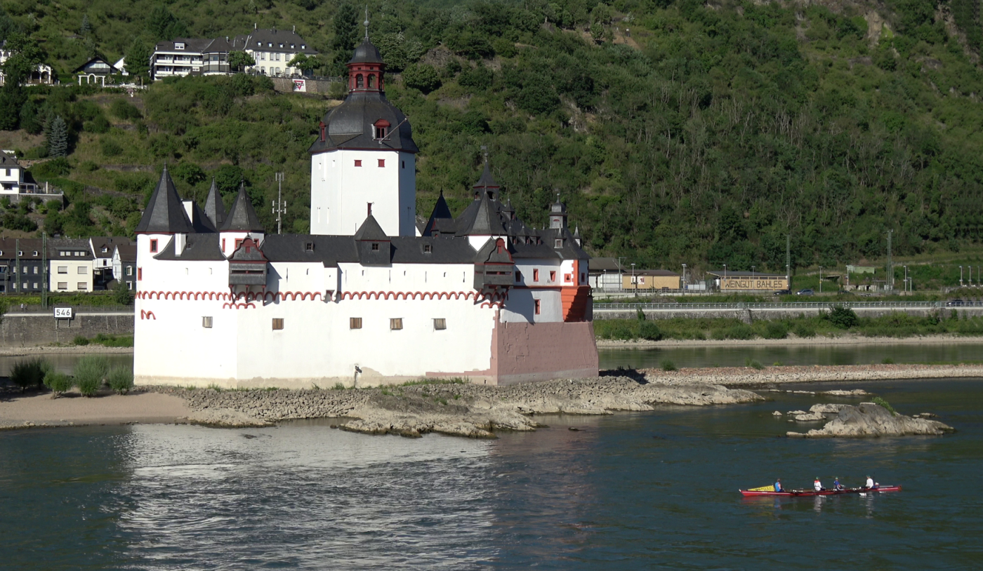 Für die übrigen zwölf Teams hieß es nach kurzem Stopp bei der MRG wieder „alles vorwärts – los!“. Bei Eltville breitet sich der Rhein kilometerweit aus und hatte eine sehr geringe Fließgeschwindigkeit. Starker Westwind und unruhiges Wasser zehrte an den Kraftreserven. Endlich vorbei an Rüdesheim. Schnell noch ein Stoßgebet hinauf zur hl. Hildegard und der schönen Abtei über den Weinbergen bevor die Ruderinnen und Ruderer das UNESCO Weltkulturerbe, das romantische Mittelrheintal ansteuerten. In Bingen riggerten dann fünf Teams ihre Boote ab. Das Boot der RTG Wesel-Niederrhein machte mit einer Spendenaktion pro Humanität (APH) "Rudern für Benin" auf sich aufmerksam: Jeder der geruderten Kilometer wird von Sponsoren unterstützt (rudernfuerbenin@web.de)!