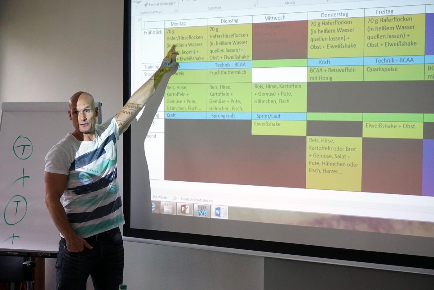 Obwohl letzteres manchmal ganz schön mitreißend sein kann. Ob es tatsächlich am Testosteron lag, mag ein Biologe beurteilen, aber was auch immer Uwe von Renteln bei seinen Vorträgen antreibt, ich würde bezahlen, um mir das nochmal anzuhören. Mit einem Energieüberschuss, der locker gereicht hätte, um das Licht in der Akademie an diesem Abend einfach eingeschaltet zu lassen, referierte er derart überzeugend über das Thema Ernährung, dass ich, noch bevor es am nächsten Tag mit angenehm irren Flipchart-Grafiken weiterging, beschloss, meine Essgewohnheiten radikal umzustellen. Und ich wette, auch Christoph dachte darüber nach, auch wenn er es nie zugäbe. Als zweiter Referent im Oktober legte Uwe die Messlatte damit ziemlich hoch für die verbleibende Lehrgangszeit und wurde in dieser Form nicht erreicht, was die Leistung von Thorsten Kortmann (Rudertechnik) und Hauke Meyer-Koop (Stabilisationstraining) aber keinesfalls schmälern soll, die unbestreitbar mit Kompetenz und ihrer jeweils ganz eigenen Art auf Ihrem Gebiet überzeugen konnten. Wenn ich ehrlich bin, hätten wir ein zweites solches Informationsbombardement wohl auch nicht unbeschadet überstanden.