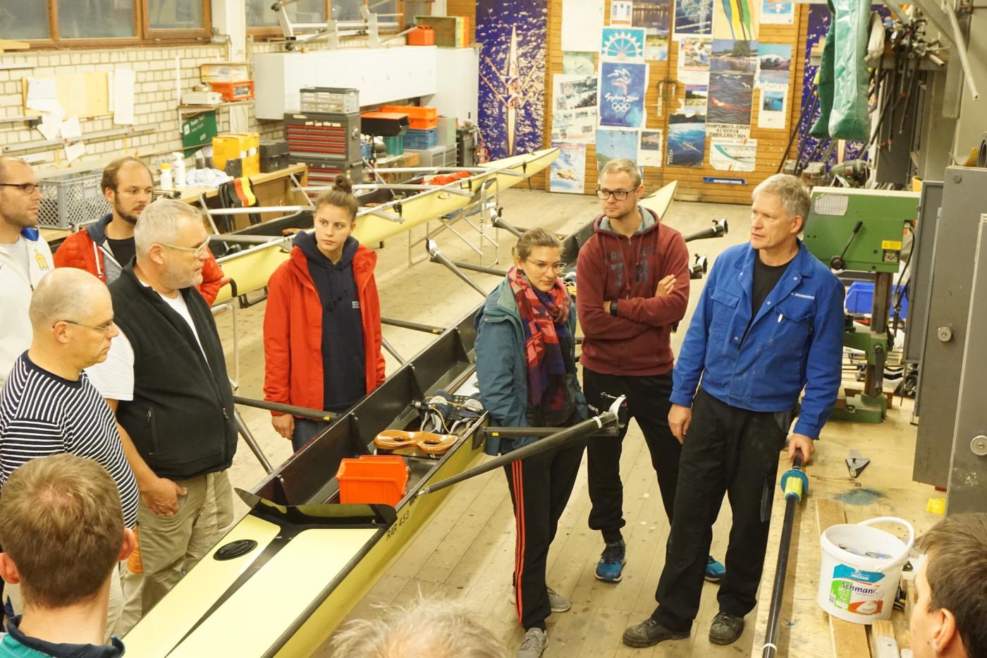 Bootsmeister Kay-Uwe Brodersen hat in seiner kleinen Praxisanleitung zum Trimmen von Booten leider einen entscheidenden, aber nicht unsympathischen Fehler gemacht: Das einzustellende Boot in dieselbe Halle zu legen wie einen unbestreitbar wunderschönen selbstgebauten Holz-Coastal-Rowing-Einer und zu versuchen, die uneingeschränkte Aufmerksamkeit einer Gruppe von 14 Personen zu gewinnen, ist nahezu unmöglich. Das hätte auch Uwe nicht geschafft.