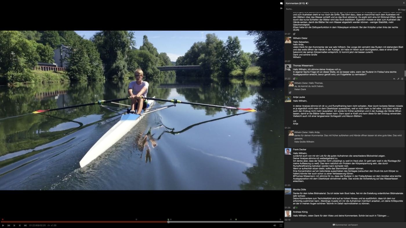 Die E-Learning Plattform des Lehrgangs – edubreak®SPORTCAMPUS – ermöglichte eine räumliche und zeitliche Unabhängigkeit bei der Bearbeitung der Aufgaben. So konnten auch eine längere Zugfahrt oder ein paar Stunden im Urlaub für den Lehrgang genutzt werden. Diese Freiheit erlaubte und erforderte eine sehr intensive Auseinandersetzung mit dem Thema Rudertechnik. Der Zeitdruck einer Präsenzveranstaltung fehlte. Die hier über die Vorgaben des Lehrgangs hinaus investierte Zeit ist gut angelegt, weil die Ergebnisse sofort für die Trainerarbeit nutzbar sind. Die Gesamtdauer des Lehrgangs von Mai bis September 2017 war gut gewählt. Die Bedienung der Lernplattform war einfach. Der Videoplayer war wie gewohnt zu bedienen. Mit der etwas versteckten Zeitlupenfunktion ließen sich auch schwierig zu erkennende Details der Ruderbewegung erfassen.