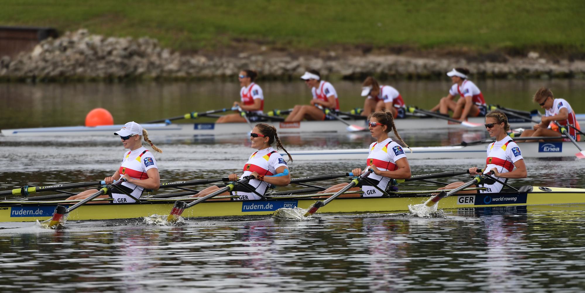 Für Daniela Schultze (Ruder‐Club Potsdam e.V.), Charlotte Reinhardt (Ruderverein Dorsten e.V.), Frauke Hundeling (Deutscher Ruder‐Club von 1884 e.V.) und Frieda Hämmerling (Rudergesellschaft Germania e.V. Kiel) ging es heute im Frauen-Doppelvierer auf der Außenbahn um die Medaillen. Die Mädels wollten wie bei der EM über diese Bahn für eine Überraschung sorgen und fast hätte es auch mit der WM-Medaille geklappt. In einem Herzschlagfinale lagen alle Boote lange Zeit gleichauf, das deutsche Quartett lieferte sich einen Zweikampf mit den Briten um den dritten Platz. Ein Nervenkrimi bis zum Schluss. Am Ende fehlten den Mädels von Marcin Witkowski keine zwei Sekunden zu Bronze, aber auch mit Rang vier können sie sehr zufrieden sein. Weltmeister wurden die Niederländerinnen vor den Booten aus Polen und Großbritannien. „Das war ein gutes Rennen, wir haben vom ersten Schlag an alles gegeben und waren fokussiert, unseren Plan umzusetzen. Wir wollten bis zur 1000 m Marke an den Australierinnen vorbei, das hat leider erst später geklappt. Jetzt wird es etwas dauern, das zu verarbeiten, aber wir haben das Bestmögliche gegeben“, so eine erschöpfte Frauke Hundeling nach dem Finale.