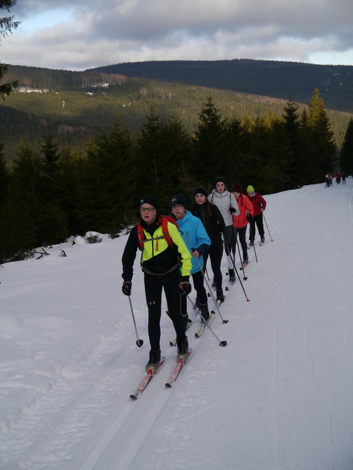Nach langer Busfahrt mit Stau und Regen wurden wir Freitagabend in Schierke mit guten Schneebedingungen und einer warmen Mahlzeit begrüßt und bald war auch jeder (kurzzeitiger) Besitzer eines Paares Langlaufski. Am nächsten Morgen ging es gleich nach dem Frühstück in Richtung Loipe. Dort machten wir uns spielerisch warm, trainierten zunächst das einbeinige Gleichgewicht und so langsam entwickelte sich auch bei denjenigen, die noch nie auf Ski gestanden hatten, ein Gefühl für die „langen Latten“. Fleißig wurden der Grätenschritt und der Schneepflug geübt, sodass nach ca. zwei Stunden alle Kinder in der Lage waren, einen Berg zu besteigen und diesen auch stehend wieder herunter zu kommen.