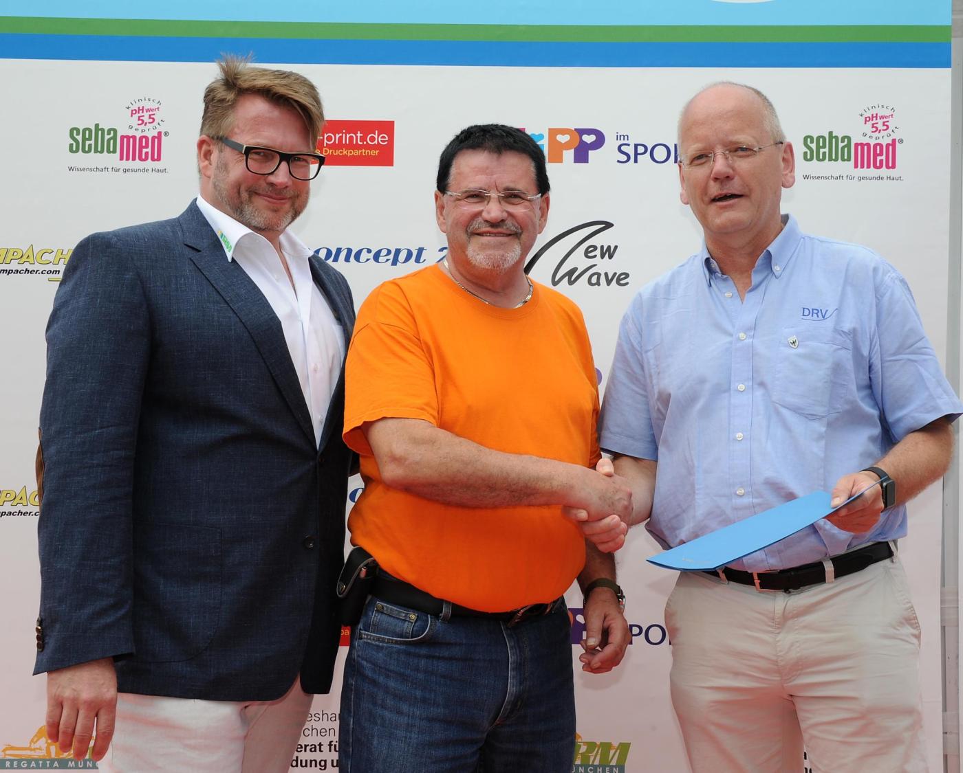Der stellvertretende Vorsitzende des DRV, Dag Danzglock, zeichnete ihn daher im Namen des DRV aus und überreichte ihm die zugehörige Urkunde für besondere, erfolgreiche und langjährige ehrenamtliche Arbeit. Thomas Stamm, Präsident des Bayerischen Ruderverbandes, verlieh ihm die silberne Ehrennadel des BRV. Oliver Bettzieche, Vorstandsvorsitzender von Regatta München e.V., honorierte seine Leistung mit einer erstmalig verliehenen Ehrenmedaille des Regattaverbands und überreichte ihm zwei Handtücher zum Abschied. „Jürgen steht wie kein anderer für kontinuierliche Verlässlichkeit im Einsatz, dabei erledigte er seine Arbeit im Zielturm gerne mit einem Handtuch um den Hals. Einfach unverkennbar!“, stellt Oliver Bettzieche fest. „Ich bedanke mich im Namen der Münchener Regattaveranstalter herzlich für die unzähligen Stunden an akribischer Arbeit!“