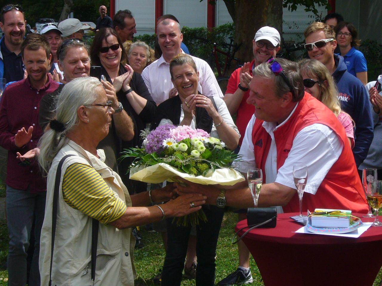 Es waren viele gekommen zu der Verabschiedung von Landestrainer Klaus „Epfel“ Günther auf dem Rasen vor dem Bootshaus des Breisacher Rudervereins. Flaggen wehten, der Sekt wartete, die Sonne schien und die Regatta-Mittagspause der Landesmeisterschaft war ein guter Zeitpunkt, um Abschied zu nehmen. Der Breisacher Ruderverein-Vorsitzende Hendrik Erhard begrüßte zahlreiche Gratulanten und Gäste, langjährige und neuere Wegbegleiter des zu Ehrenden, Aktive und ehemalige Aktive, Vereinsvorsitzende aus dem ganzen Land und der Vorstand und fast der gesamte Berat des LRV Baden-Württemberg.