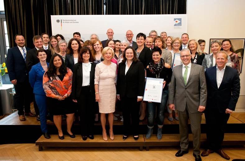 Bundesministerin Andrea Nahles bei der Urkundenverleihung: „Die Arbeitswelt wandelt sich permanent, die Herausforderungen für Unternehmen und Beschäftigte nehmen durch die Digitalisierung zu. Mehr denn je gilt: Wer den rasanten Wandel in der Arbeitswelt erfolgreich bestehen will, muss ihn gemeinsam mit den Beschäftigten gestalten. Deshalb ist es gut, wenn sich Unternehmen und Verwaltungen gemeinsam mit ihren Mitarbeiterinnen und Mitarbeitern aufmachen und ihre Unternehmenskultur zukunftsfähig aufstellen. Das Audit „Zukunftsfähige Unternehmenskultur“ steht für diesen gemeinsamen Spirit.“
