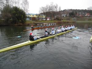 Oberhalb der Schleuse warteten bereits der Nikolaus und zahlreiche Schaulustige auf das Eintreffen der Boote. Die Ruderer begrüßten den Nikolaus mit einem dreifachen: „Carolinum – hohoho!“ Der Ehrengast bedankte sich mit einer launigen und nachdenklichen Rede, lud alle zu Kuchen sowie Kakao ins Bootshaus ein und wünschte eine gute Heimfahrt.