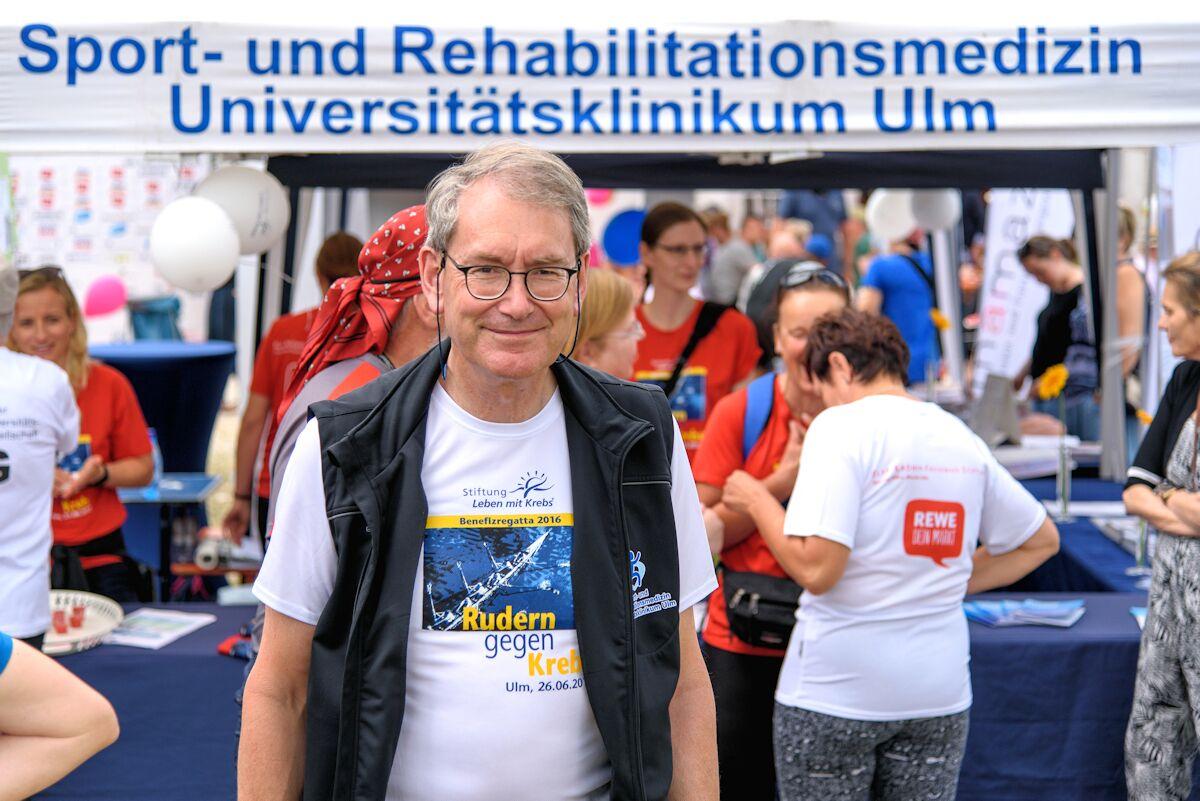 Vor Ort war auch einer der beiden Schirmherren der Veranstaltung, der Ulmer Oberbürgermeister Gunter Czisch, der zusammen mit Professor Jürgen Steinacker (Leiter der Sektion Sport- und Rehabilitationsmedizin), Professor Wolfgang Janni (Ärztlicher Direktor der Klinik für Frauenheilkunde und Geburtshilfe) und dem Uni-Vizepräsidenten für Forschung und Informationstechnologie, Professor Joachim Ankerhold, sowie mit Andreas Huber (1. Vorsitzender des URCD) alle Teilnehmer und Zuschauer in der Friedrichsau begrüßte. Neben dem sportlichen Wettkampf stand die Information über das Leben mit und nach Krebs im Mittelpunkt. Regionale Selbsthilfegruppen und Vereine informierten Zuschauer und Interessierte über ihre Aktivitäten und auch darüber, wie wichtig Sport bei einer Krebserkrankung sein kann. Und auch für die Kleinsten kam der Spaß nicht zu kurz: ulmskleinespatzen e.V. lud zum Benefiz-Kinderfest in der Friedrichsau mit Hüpfburg, Kinderschminken und einer Tombola.