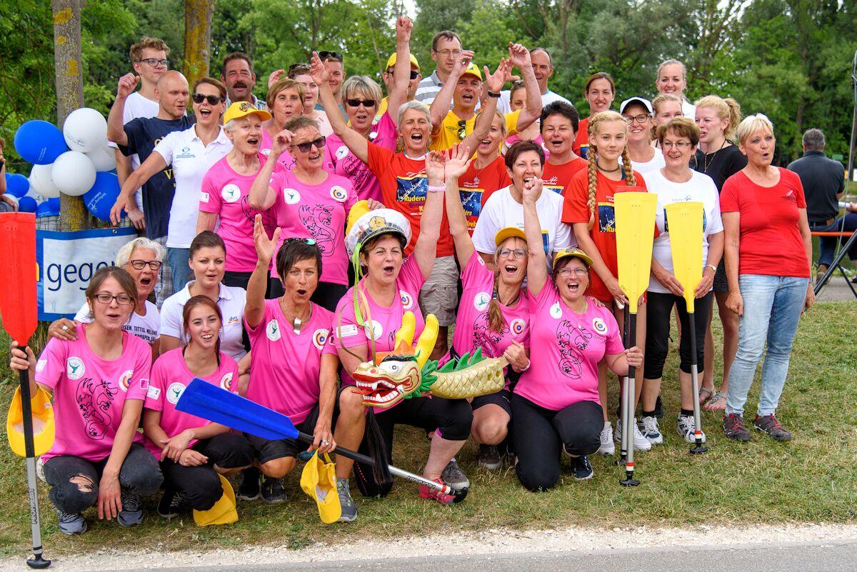 Ein kleines Highlight war neben den spannenden Finalrennen ein Einlagerennen mit zwei Drachenbooten und 36 Teilnehmern. Dabei hatten die hauptsächlich unerfahrenen Teilnehmer, darunter Patienten aus Ulm, den Frauen-Selbsthilfegruppen Ulm und Ehingen, beste Unterstützung von den Tübinger „Pink Paddlers“, die den Sport regelmäßig ausüben und die übrigen Teilnehmer mit Unterstützung des URCD professionell auf das Rennen vorbereiteten. Selbst Stefan Grünewald-Fischer, Projektleiter der Stiftung Leben mit Krebs, und Kerstin Stöhrer (Leitung Organisationsteam URCD) stiegen spontan mit in die großen, mit einem Drachenkopf geschmückten Boote, um an dem sportlichen Spektakel teilzunehmen.