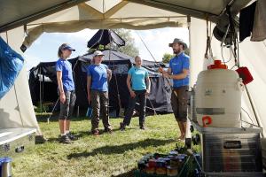 Intensive Kennenlernrunden und Spiele sorgten für Abwechslung, genauso wie kleine Spaziergänge und Waldexpeditionen. Dort lernten wir von den drei Wildnisführern der WWF, Christian, Anna Lena und Phil viel über die nachhaltige Art Feuerholz zu sammeln. Nicht zuletzt war von großer Bedeutung, dass sich Hasel- und Weidestöcke perfekt zum Stockbrot- und Marshmallowgrillen eignen. Stockbrotteigkneten eignet sich übrigens perfekt als Fingerkrafttraining, wie die Stockbrotmannschaften einvernehmlich und lautstark verkündeten. Abends versammelten wir uns regelmäßig in einer Jurte, einem 12-eckigen Zelt, welches an der Spitze ein auffaltbares Dach besitzt und in dem man Feuer machen kann. Es stellte sich als waren Segen heraus sich nach einem Regenschauer in der Jurte zu wärmen und abends der Heldenrunde beizuwohnen. Jeden Abend konnte jeder der wollte einem anderen für etwas danken, was er an dem Tag gemacht hatte oder einfach nur kundtun, was ihm besonders gut gefallen hat. Bei dieser schönen Variante den Tag revue passieren zu lassen, wurde dafür gedankt, dass das Essen gut gekocht wurde, dass jemand eine tolle Geschichte erzählt hat und die heutige Rudermannschaft gute Laune im Boot hatte. Gekocht haben in den meisten Fällen die Jugendlichen im Team auf ihren eigenen Sturmkochern.