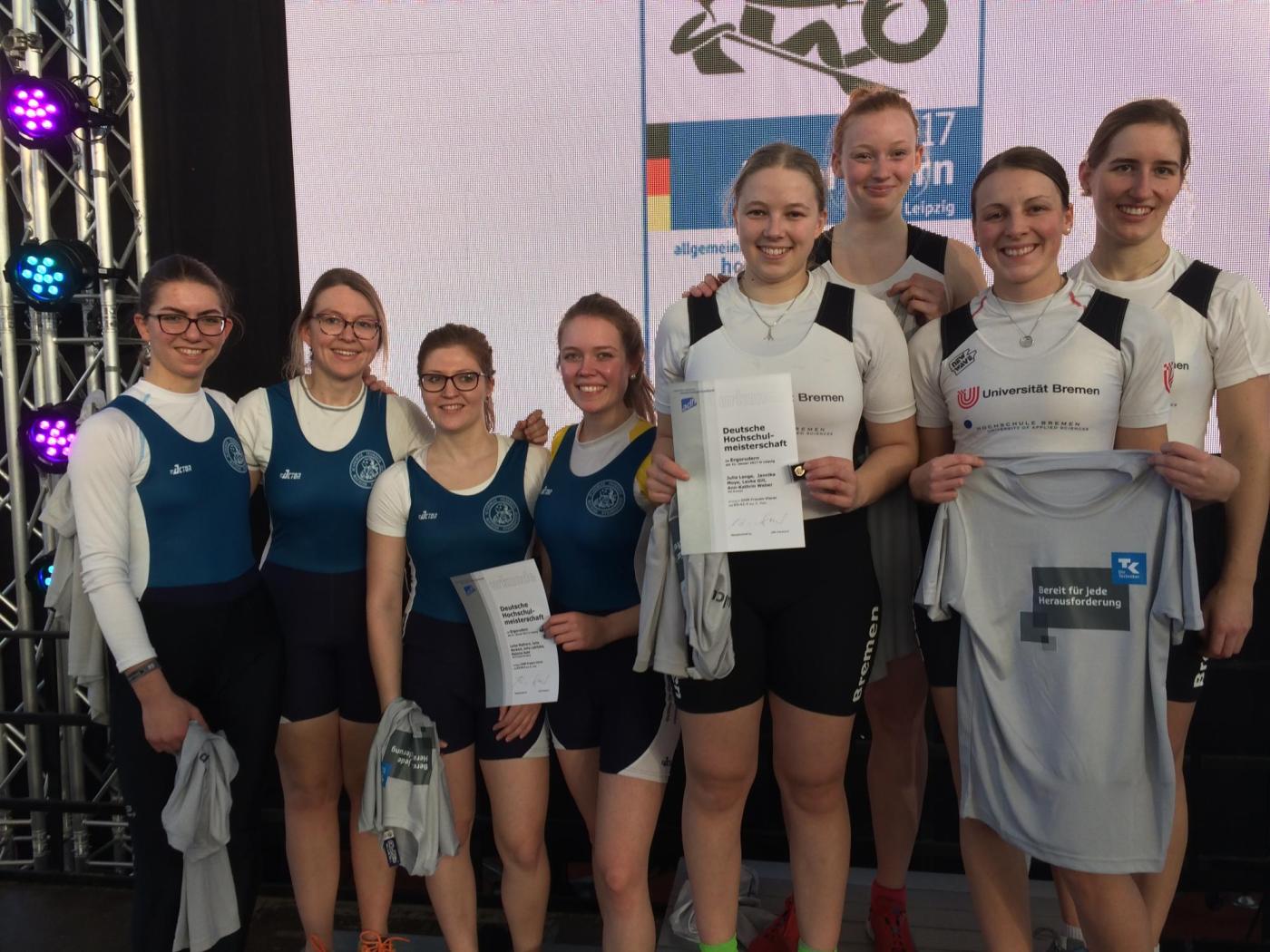 Den Abschluss der DHM bildete ein toller Mixed-Achter mit sechs Sprintteams. Im ersten Lauf gab es ein hauchdünnes Duell der Uni Leipzig mit der Renngemeinschaft TU Dresden/WG Bremen/HS Bremerhaven. Die norddeutsche Renngemeinschaft setzte sich mit 1:04,8 Minuten am Ende durch. Weder die Uni Kassel, noch die Uni Erlangen-Nürnberg oder die WG Halle konnte diese Zeiten unterbieten. Einzig die erste Besetzung der WG Bremen in Renngemeinschaft mit der HS Bremerhaven konnte eine noch schnellere Zeit anbieten und sicherte sich mit Lukas Peer, André Müller, Nils Hülsmeier, Stefan Giesen, Levke Gill, Ann-Kathrin Weber, Jannika Moye und Melanie Baues in 1:03,0 Minuten Gold.