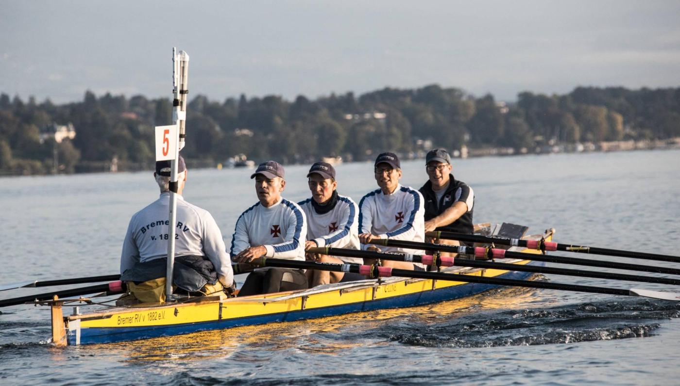 Bereits eine Stunde vor dem offiziellen Regattastart ging Christian Klandt in der Morgendämmerung um 7:00 Uhr mit seinem C-Einer ins Rennen. Zum 30er Jubiläum stellte er sich einmal mehr der besonderen Herausforderung, den See im Alleingang zu umrunden; eine recht exklusive Spezialität von ihm, die Klandt bereits zum dritten Mal nach 2001 und 2012 anging. Die 14 gesteuerten C-Vierer nahmen pünktlich um 8 Uhr die Verfolgung auf. Trotz des übersichtlichen Meldefeldes und der Weite des Sees ging der Massenstart auch dieses Mal nicht ganz ohne Berührungen über die Bühne, jedoch ohne größere Auswirkungen. Das Feld sortierte sich recht schnell, und bis zur 90°-Wendeboje vor dem Hotel Président nach knapp 1 km waren die Favoritenboote schon an der Spitze, zunächst mit der deutsch-niederländischen Rgm. in Front. Die Spätstarter aus Bonn/Hamburg/Hamm/Nürtingen – kleine Bummeleien bestraft der Starter sofort – konnten sich in den folgenden Minuten Zentimeter für Zentimeter heran und vorbei schieben. Nach etwa 10 Minuten hatte das Rennen einen neuen Führenden. War jetzt eigentlich ein Kopf-an-Kopf-Rennen erwartet worden, so brachte der interessante Mannschafts-Mix aus Streckenrekordlern und Hamburger Novizen zunehmend Wasser zwischen die Boote. Der Abstand wuchs in der Folge unabhängig von den Steuer-Ruderkonstellationen kontinuierlich und betrug bei den ersten Kontrollpunkten Versoix, Nyon und Rolle 35 Sekunden, 1:30 und 4 Minuten. Dabei wurde der erste ortsfeste Zeitnahepunkt in Rolle vom Führungsboot nach 2:20 h und damit lediglich 2 Minuten über dem Rekord von 2011 passiert. Spannender als an der Spitze des Feldes ging der Kampf um die Plätze vor sich. Das Masters-Team von Bremen/Mülheim hatte sich in der Anfangsphase auf dem dritten Platz festgesetzt und durchfuhr die Kontrollstelle in Rolle nach 2:33:10 h. Innerhalb von 2:40 Minuten folgten gleich 4 Boote: das Mixed-Team aus Oldenburg, die schweizerischen Vereinsteams der SN Genève und des CA Vevey sowie die Neuwieder RG. Als einziges weiteres Team war jenes der Rgm. Hamburg (ARC Alania/Lufthansa Sportverein/RV Wandsbek) noch in Tuchfühlung.