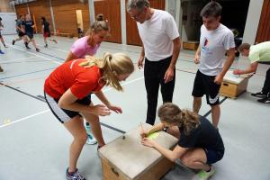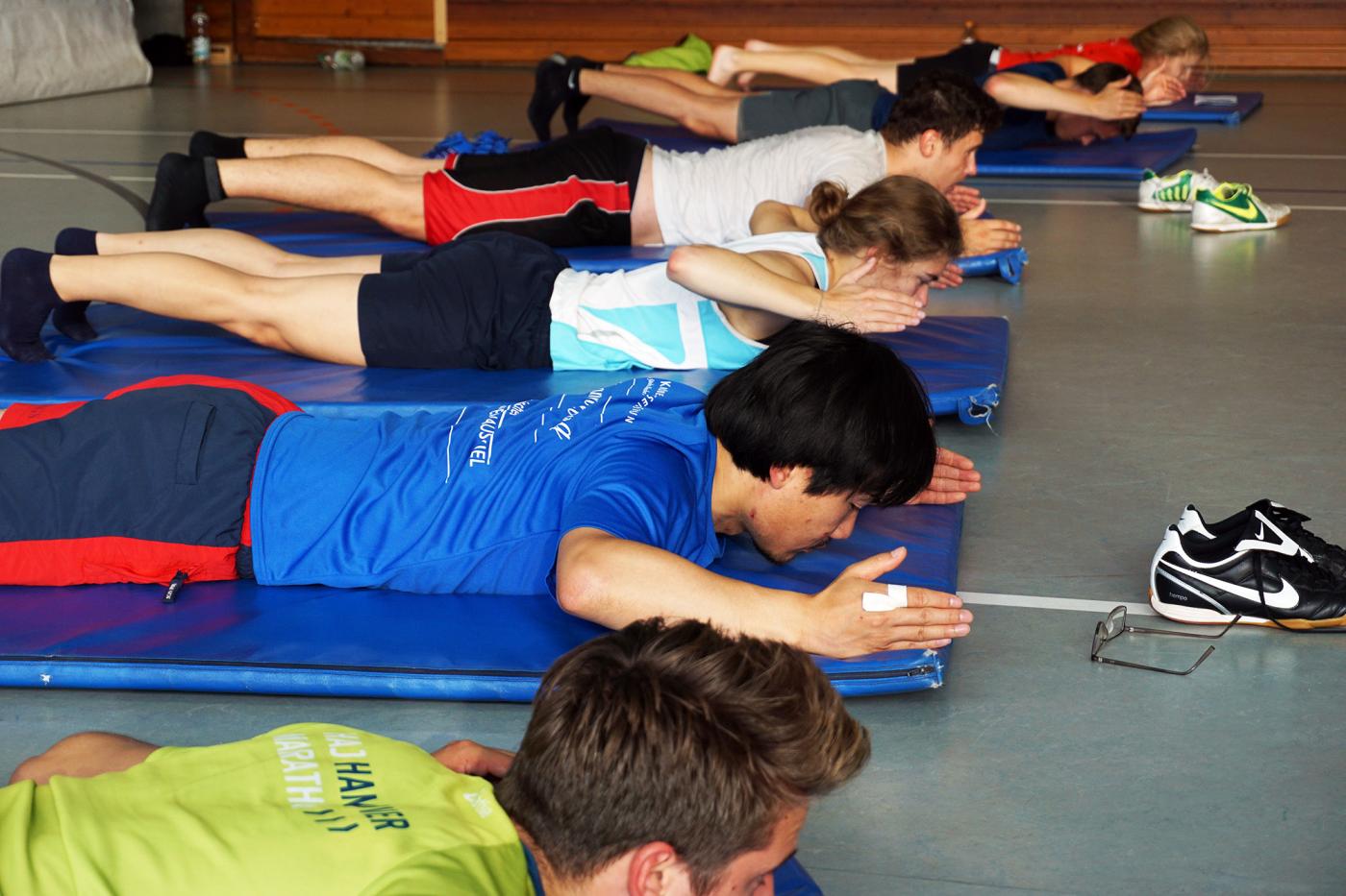 Die Wissensvermittlung fand dabei nicht nur frontal und theoretisch im Seminarraum oder den Sport- und Bootshallen statt, sondern wir wurden interaktiv mit zahlreichen praktischen Teamübungen und -spielen wie zielgruppengerechter Sportstundenplanung und -durchführung, Trainingsplanung oder Koordinations- und Stabilitätsübungen, wie z. B. dem „betrunkenen Seeigel“ oder der „Gallionsfigur“, et al. gefordert; denn wie einer der Teilnehmer verkündete: „Das Hemd schwitzt net von allein.“