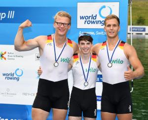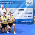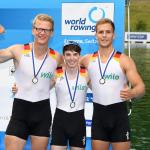 Ihren ersten Weltcup-Sieg in der nicht-olympischen Bootsklasse des Männer-Zweiers mit Steuermann feierten Malte Großmann, René Stüven und Jonas Wiesen (Stm.). Die von Christian Viedt trainierten Jungs haben das Rennen von Beginn an dominiert und mit über einer Bootslänge Vorsprung gewonnen. „Das war heute ein echt gutes Rennen, gerade auch im Vergleich zu gestern, da sind wir nach 1000 m schon eingegangen“, so Malte Großmann. „Man will immer sein Bestes geben, ob es dann für den ersten Platz reicht ist dann immer die andere Sache. Heute hat es aber gut geklappt und wir freuen uns“, ergänzt Rene Stüven.