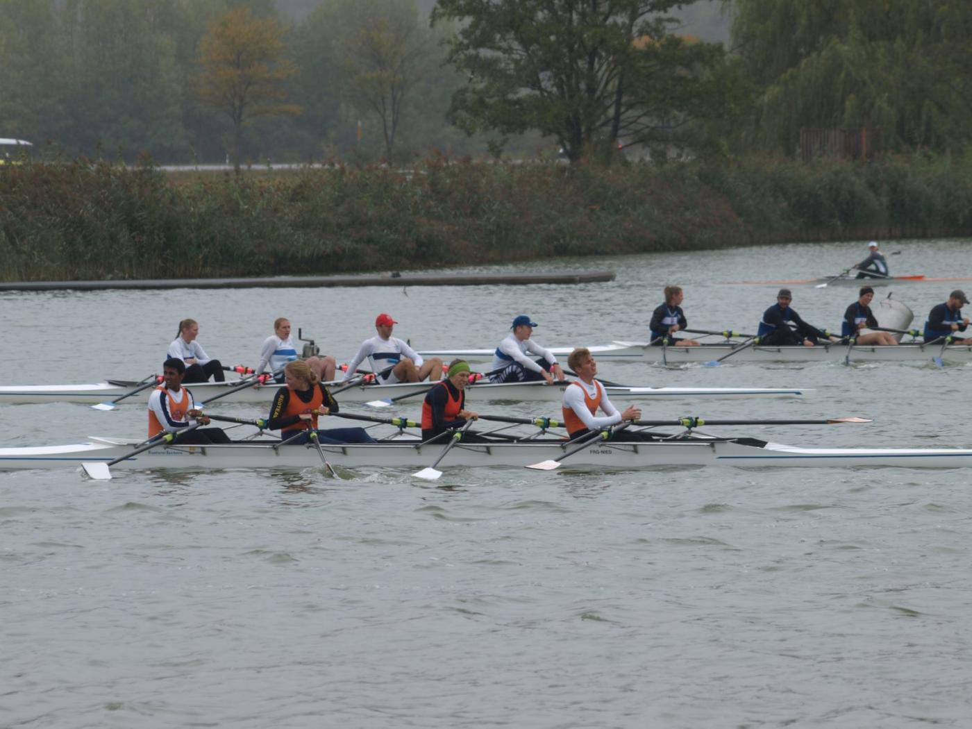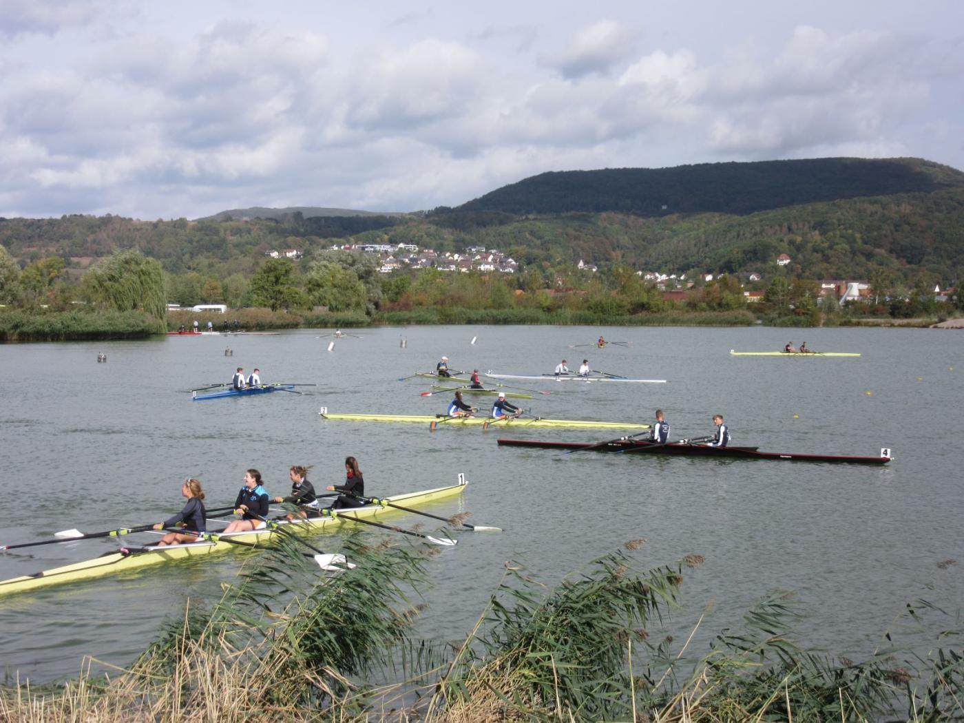 Die Hessischen Rudermeisterschaften wurden in diesem Jahr zum 29. Mal auf dem Werratalsee in Eschwege ausgetragen. Selten waren die Wetterbedingungen so wechselhaft. Die Rennen am Samstag über eine Länge von 1000 Metern fanden bei permanentem Gegenwind in Kombination mit starken Böen und tückischen Wellen statt. Am Samstag abend begann es dann zu regnen und hörte auch bis zum Regattaende nicht mehr auf. Über die Sprintdistanz von 350 Metern galt es dann vor allem mit feuchten Griffen an Skulls und Riemen zu kämpfen. Es waren somit erhebliche Herausforderungen für alle Beteiligten zu meistern: Ausrichter und Organisation vom Eschweger Ruderverein, Schiedsrichter, Trainer und natürlich in erster Linie die Aktiven, deren ruderisches Können bei den schwierigen Bedingungen umso mehr gefordert war. Nur die Nebelhörner konnten in diesem Jahr verpackt bleiben.