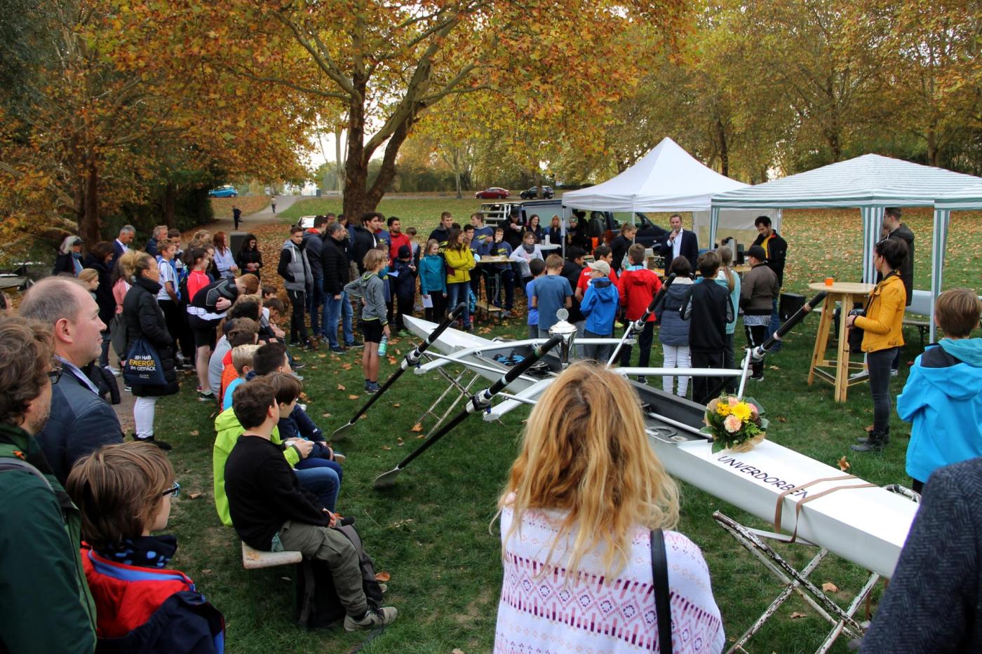 Das gemeinsame Abrudern der Schulen und der Vereinsjugend der Rudergesellschaft im Schiersteiner Hafen wurde Ende Oktober zum großen Spendenruderfest mit Bootstaufe. Neben den Schülern und Eltern waren auch Vertreter der Stadtpolitik und die Schulleitungen anwesend. Die drei Schulleiter der Elly-Heuss-Schule, der Gutenbergschule und der Humboldt-Schule waren sichtlich zufrieden mit dem regen Treiben am und auf dem Wasser, welches eine enorme Bereicherung des Ganztagsangebots der Schulen ist.