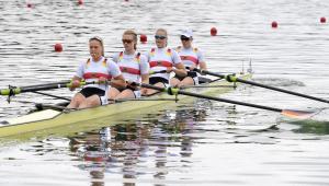 Nach dem tollen Auftakt in Linz, lief es für den Frauen-Vierer ohne Steuerfrau in Luzern nicht wie geplant. Die vergangenen zwei Wochen hat Trainer Werner Nowak genutzt, um Sophie Oksche (Donau-Ruder-Club Ingolstadt e.V.), Frauke Hacker (Olympischer Ruder-Club Rostock von 1956 e.V.), Alexandra Höffgen (Neusser Ruderverein e.V.) und Ida Kruse (Ruderverein Münster von 1882 e.V.) für Glasgow in Fahrt zu bringen. Erstes Ziel war die direkte Finalqualifikation im Vorlauf und das ist dem Quartett souverän gelungen. Nach einem nicht optimalen Start arbeitete sich das Boot auf den zweiten 500 m auf Rang zwei vor und gab diese Position nicht wieder ab. Damit sind sie direkt für die Endrunde qualifiziert. „Wir sind auf jeden Fall zufrieden. Am Ende war es etwas ärgerlich, dass wir die Rumäninnen nicht noch bekommen haben. Aber die Bedingungen sind fair“, so Sophie Oksche und Alexandra Höffgen ergänzt „Die Strecke hier geht extrem schnell rum.“