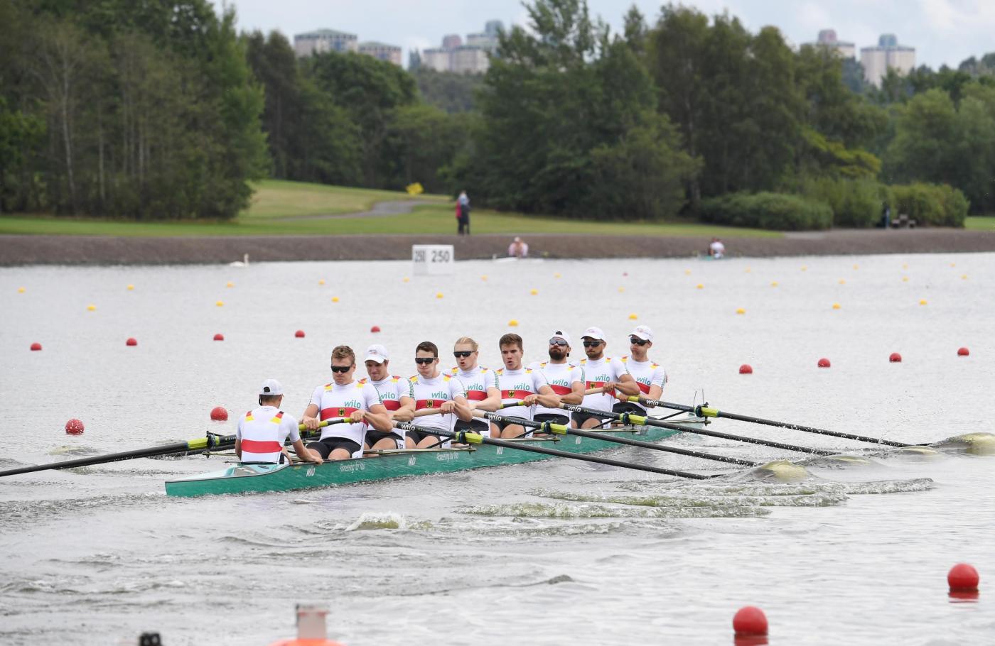 Der Deutschland-Achter ist erfolgreich in die Mission Titelverteidigung gestartet. Im letzten Vorlauf des Tages lieferte sich das DRV-Flaggschiff mit Johannes Weißenfeld (Ruderclub 'Westfalen' 1929 e.V. Herdecke), Felix Wimberger (Passauer Ruderverein von 1874 e.V.), Maximilian Planer (Bernburger Ruderclub e.V.), Torben Johannesen (Ruder-Club Favorite Hammonia), Jakob Schneider (Ruderklub am Baldeneysee e.V.), Malte Jakschik (Ruderverein Rauxel von 1922 e.V.), Richard Schmidt (Ruderverein 'Treviris 1921' e.V.) und Schlagmann Hannes Ocik (Schweriner Rudergesellschaft von 1874/75 e.V.) am Ende ein spannendes Duell mit den Rumänen. Die 500-m-Marke überquerten die beiden Boote zeitgleich. Im weiteren Rennverlauf konnten sich die Jungs von Trainer Uwe Bender etwas absetzen und hatten bis 1750 m fast eine Bootslänge Vorsprung rausgerudert. Dann nahm die deutsche Crew das Tempo etwas raus und die Rumänen konnten mit einem schnellen Endspurt noch einmal bis auf eine halbe Sekunde an die Deutschen ranfahren. Als Vorlaufschnellster ist das DRV-Flaggschiff seiner Favoritenrolle auf jeden Fall gerecht geworden. „Unser Steuermann ist heute auf Auge gefahren. Wir haben früh das Tempo rausgenommen, da sind die Rumänen mit einem schnellen Schlussspurt noch nah rangekommen. Im Finale müssen wir das Rennen dann ausfahren“, erklärt Bender.