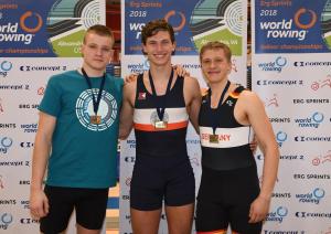Für die 14-18 jährigen Junioren ging es dann bereits um WM-Medaillen. Mit Cosima Clotten (Neusser RV), Max von Bülow (RV Ems-Jade Weser) und Floyd Benedikter (RV Münster) hatte Mannschaftsleiter und Headcoach Boris Orlowski gleich drei amtierende Deutsche Meister von den nationalen Titelkämpfen von vor zwei Wochen in Essen-Kettwig dabei. Als Erster musste sich Max von Bülow bei den Leichtgewichts-Junioren der internationalen Konkurrenz stellen. Der Oldenburger fuhr ein sehr engagiertes Rennen und wurde am Ende guter Sechster in 6:34,6 Minuten. Cosima Clotten dominierte bei den 18 jährigen Leichtgewichts-Juniorinnen das Rennen. Leider war der jüngere Jahrgang so stark, dass drei 17 jährige Athletinnen noch an ihr vorbei zogen und die Neusserin in 7:25,9 Minuten hauchdünn die Podiumsplätze verpasste und den undankbaren 4. Platz belegte. Floyd Benedikter sorgte dann für die erste WM-Medaille für das „Concept2 Team Germany“. Er fuhr ein taktisch kluges Rennen und belegte am Ende in 6:10,7 Minuten den Bronzerang.