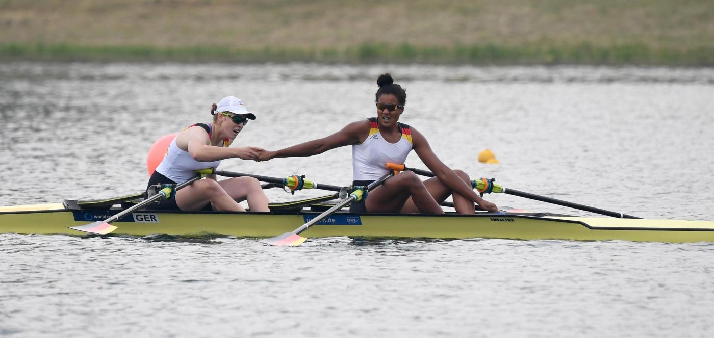 Franziska Kampmann (Ruderverein Waltrop von 1928 e.V.) und Carlotta Nwajide (Deutscher Ruder-Club von 1884 e.V.) sind derzeit in Top-Form. Das Duo konnte nach dem Vorlauf auch das Halbfinale gewinnen. Mit einem Start-Ziel-Sieg haben sich die Schützlinge von Trainer Premsyl Panuska ungefährdet für das Finale qualifiziert, wo sie morgen um die Medaillen mitrudern werden.