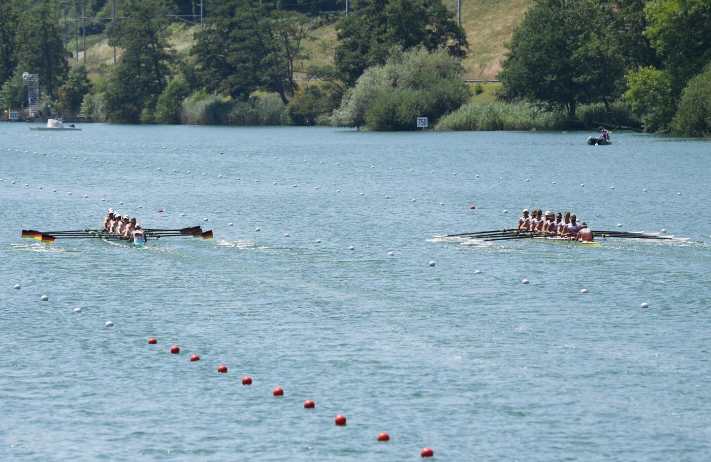 Für die beiden Frauen-Doppelvierer geht es in Luzern um die WM-Qualifizierung – das schnellere Boot reist nach Plovdiv. Bereits im Vorlauf trafen die beiden Boote aufeinander. Lange Zeit sah es nach einem deutschen Zweikampf aus. GER 1 mit Marie-Cathérine Arnold (Hannoverscher Ruder-Club von 1880 e.V.), Carlotta Nwajide (Deutscher Ruder-Club von 1884 e.V.), Franziska Kampmann (Ruderverein Waltrop von 1928 e.V.) und Frieda Hämmerling (Rudergesellschaft Germania e.V. Kiel) lag nach der Streckenhälfte mit einer halben Bootslänge vor GER2 mit Charlotte Reinhardt (Ruderverein Dorsten e.V.), Frauke Hundeling (Deutscher Ruder-Club von 1884 e.V.), Carina Bär (Heilbronner Rudergesellschaft 'Schwaben' von 1879 e.V.) und Michaela Staelberg (Crefelder Ruder-Club 1883 e.V.). Während das erste deutsche Boot um Schlagfrau Frieda Hämmerling die Führung immer weiter ausbauen und zu einem souveränen Sieg inklusive Finaleinzug rudern konnte, wurde das zweite deutsche Boot von Polen und am Ende auch von den Niederländerinnen überholt und wurde am Ende Vierter. Damit müssen sie morgen im Hoffnungslauf noch einmal ran. „Das war ein richtig guter Einstieg, wir sind sehr zufrieden“, freut sich Frieda Hämmerling. „Wir freuen uns, dass wir morgen einen Tag Pause haben und uns auf das Finale am Sonntag konzentrieren können.“ Disziplintrainer Frauen-Skull, Marcin Witkowski, zeigte sich ebenfalls zufrieden. „Die beiden Boote sind lange zusammen gefahren. Die ersten 1250 m laufen immer gut, aber am Ende sind die Mädels zu müde für einen Endspurt. Bei den kommenden Rennen müssen sie die erste Strecke etwas lockerer angehen, um die Körner für den Schlussspurt zu haben.“