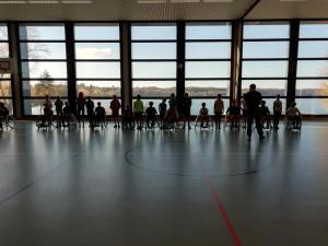 Am Samstag starteten 16 freiwillige Frühsportler bei traumhaftem Panorama – Mondsichel und Nebel über dem Küchensee – sportlich in den Tag, während die anderen sich noch einmal in ihrem Bett herumdrehten. Nach dem Frühstück ging es los mit den Programmpunkten des Tages. Die Jahrgänge 06-08 durften sich von unserem Referenten Moritz in die Erste Hilfe einweisen lassen und übten die stabile Seitenlage, legten sich gegenseitig Verbände an und klärten alle Fragen rund um Verletzungen im Rudersport. Der Jahrgang 2005 wurde indes in der Sporthalle der Ruderakademie Ratzeburg vom Hamburger Landestrainer Bernd Eickemeyer, seinem Sohn Lasse, 15 Rollstühlen und vielen Basketbällen empfangen. Spielerisch wurde zunächst der Rollstuhl erprobt und bereits beim Spiel „Romeo und Julia“ zeigte sich, dass sich Ruderer nicht nur auf dem Wasser, sondern auch auf vier Rollen durchzusetzen wissen! Bernd erklärte die Regeln und bald wurden die Spiele gestartet. Diejenigen, die gerade nicht auf dem Spielfeld waren, übten mit den normalen Rollstühlen Slalomparcours und testeten, wie man es schafft, über eine Turnmatte zu fahren – spätestens danach hatten alle den größten Respekt vor den Rollifahrern, die sich im Hamburger Straßenverkehr mit all den hohen Kantsteinen fortbewegen müssen! Die Begeisterung war riesig und wir mussten zeitweise befürchten, einige unserer Nachwuchssportler an den Hamburger Rollstuhlbasketballverband zu verlieren!