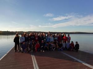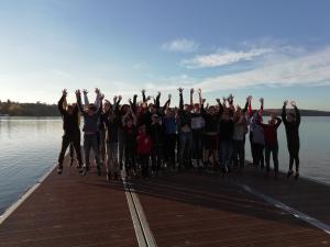 Nach dem Mittagessen wechselten die Gruppen und es zeigte sich, dass auch die älteren Kids Verbände wickeln und auch die jüngeren Hamburger Ruderkinder Rollstuhlbasketball spielen können. Alle hatten viel Spaß und die Gesichter strahlten mit der Herbstsonne um die Wette! Kurz bevor wir in die Freizeit starteten, erreichte uns vom Rudertag aus Münster die frohe Botschaft, dass der Sockelbeitrag der Deutschen Ruderjugend NICHT um 10.000€ gekürzt wird – ein tolles Zeichen für die Jugend! In der Freizeit am Nachmittag wurden lauter gesunde Lebensmittel gekauft und konsumiert, sodass wir beschlossen, dass der Zuckerschub am Abend in der Turnhalle noch einmal abgebaut werden musste. Beim indonesischen Völkerball flogen die Bälle und bei der abschließenden Gymnastik und Kräftigung griffen die Betreuer auf die Übungen aus den Trainingsempfehlungen der Deutschen Ruderjugend zurück. Müde und geschafft fielen alle Jungen und Mädchen pünktlich um 22 Uhr in die Betten – ob in die eigenen Betten in den eigenen Zimmern, sei einmal dahingestellt! Am Sonntag starteten wir alle mit einer morgendlichen Joggingrunde um den Domsee und freuten uns danach auf ein leckeres Frühstück. Danach schaffte es die Gruppe, die Trainer vollkommen in Erstaunen zu versetzen, denn das Packen, Aufräumen und Fegen der Zimmer ging derart flott, dass die Zimmerkontrolle aller Zimmer bereits nach FÜNF Minuten zur Zufriedenheit ALLER abgeschlossen war – das war großartig!