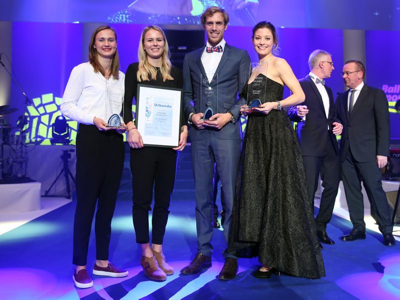 Sensation bei der Wahl zu Niedersachsens Sportler des Jahres 2017: Erstmals ging der Titel an einen Ruderer, nämlich an Julius Peschel vom DRC Hannover. Die Verkündung erfolgte im feierlichen Rahmen: Beim Ball des Sports in Hannover wurde der 27-jährige WM-Bronzemedaillengewinner und Schlagmann des Leichtgewichts-Vierers am vergangenen Freitagabend (9.2.) unter großem Beifall der mehr als 3.500 Anwesenden im Kuppelsaal des HCC ausgezeichnet. „Mega-Cool. Das ist eine Anerkennung nicht nur für mich, sondern für den ganzen Rudersport in Niedersachsen“, so Peschel. Der Ausgang der Wahlen war ziemlich spannend und knapp, denn ein paar Dutzend Stimmen entschieden am Ende: Mit 22,88 Prozent landete Julius auf Platz eins, dicht gefolgt von Triathlet Justus Nieschlag (22,61%) und Biathlet Arnd Peiffer (22,53 %). Gefeiert wurde anschließend kräftig – auch mit den weiteren Gewinnern in den Kategorien Frauen und Mannschaft, der Leichtathletin Ruth Sophie Speelmeyer (Foto, rechts) sowie den Fußball-Frauen des VfL Wolfsburg (Foto, links).