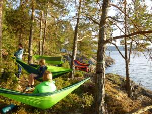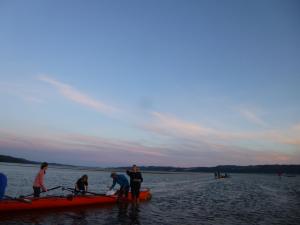 Highlights der Woche sind neben dem Erkunden der umliegenden Wälder, erfrischendem Baden im Fluss und dem stetigen Zusammenwachsen der Gruppe - natürlich - die ruderischen Erfolgserlebnisse. Bald wagt sich die Gruppe auch weiter auf den See hinaus – als Ziel haben sich die Teilnehmer*innen die naturbelassene Insel Hansholmen ausgesucht. Nach einer 25 Ruderkilometer langen Überfahrt, geplagt von starkem Wind und hohen Wellen, ist die Insel erreicht – und die Freude über den gemeinsamen Erfolg riesengroß! Die Zeit auf Hansholmen vergeht mit dem Erlernen neuer Knoten, dem gemeinsamen Kochen mit bester Aussicht auf den See, Schwimmen, Angeln, Strategiespielen und dem Erkunden der Insel wie im Flug, obwohl bereits einvernehmlich um einen Tag verlängert wurde.