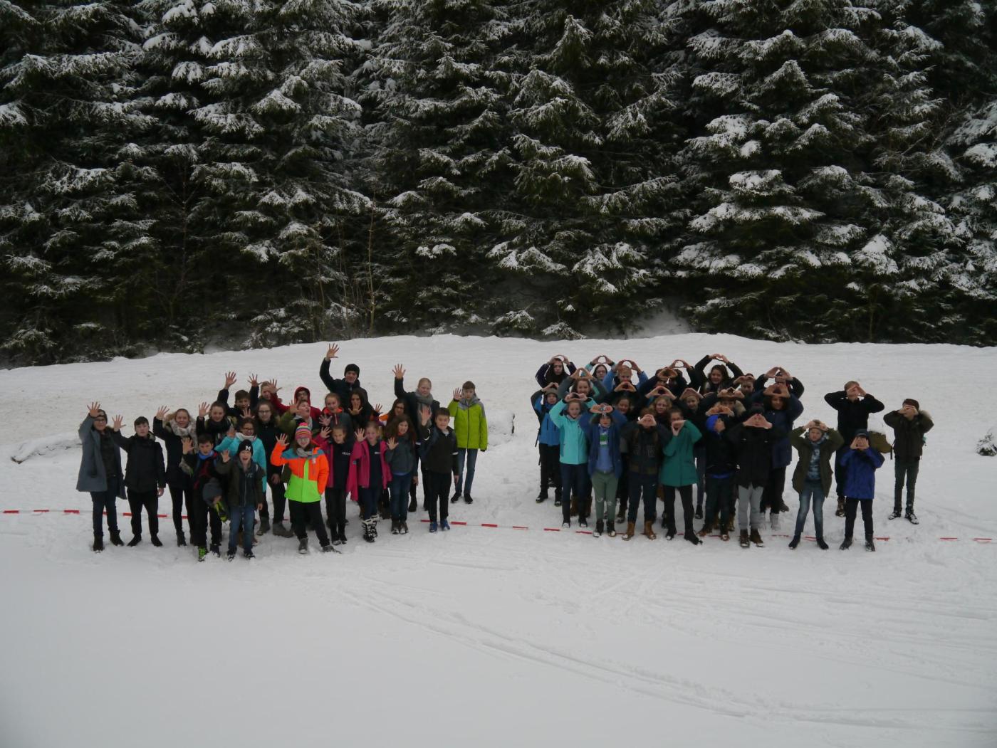 Die übrigen 34 Hamburger Jungs und Mädels trauten sich auf die große Tour und fuhren zunächst in Richtung Brocken. Von vorbeikommenden Wanderern wurden wir sofort als zukünftige Olympiasieger erkannt, allerdings mussten wir kurz die Sportart richtigstellen! Den Brockenaufstieg wollten wir aber doch nicht auf uns nehmen und entschieden uns lieber für den Abzweig nach Schierke. Von da an ging es nur noch bergab, was jedoch nicht unbedingt leichter war, denn die eine oder andere Kurve hatte es in sich. Müde und erschöpft kamen beide Gruppen fast zeitgleich in der Jugendherberge an – die einen per Bus, die anderen per Ski.