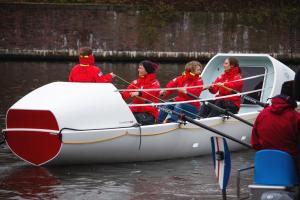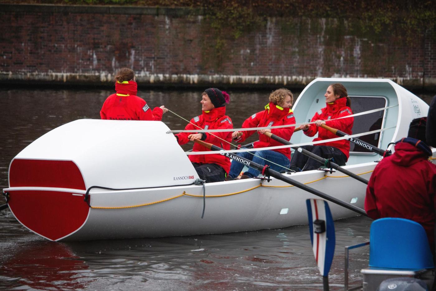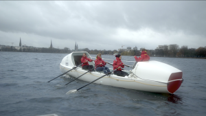 Über acht Meter lang, fast eine Tonne schwer und komplett ausgestattet 60.000 € teuer! Es war die Premiere des speziellen Ruderbootes auf der Alster. Auch Freunde und Familie der Crew konnten den „Ozean-Kreuzer“ am Samstag zum ersten Mal live begutachten. Selbst gestandene WSAP-Ruderer und die versammelte Presse staunten nicht schlecht über die hochseetaugliche Sonderanfertigung, die auf den ersten Blick einem Raumschiff ähnelt. „Während der Jungfernfahrt über die Alster haben die Gäste auf einem Alsterdampfer Fotos von uns gemacht“, erzählt Crew-Mitglied Meike Ramuschkat nach dem Anlegemanöver, super froh, dass trotz Dauerregen und fünf Grad Celsius, etwa 100 Menschen der Einladung zur Bootstaufe gefolgt sind.
