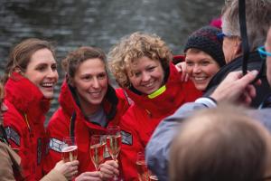 Vor der eigentlichen Taufe und der Namensverkündung des Bootes hatte die RowHHome-Crew allerdings noch eine wichtige Mitteilung zu machen: Jennifer Seibt (40, Hamburger Ruderinnen-Club) gab schweren Herzens ihren Rücktritt bekannt und übergab ihren Platz an ein neues Mitglied. Symbolisch überreichte sie die rote Crew-Jacke an Timna Kluge (25, WSAP). Die Tochter von Stefanie Kluge ist ab sofort mit an Bord von RowHHome. Jennifer Seibt wird zwar nicht mit über den Atlantik rudern, wird dem Projekt aber dennoch verbunden bleiben.