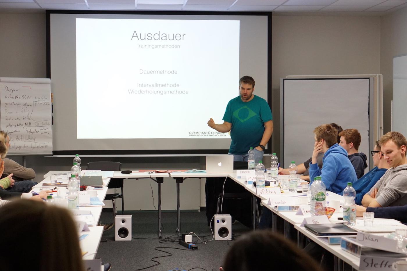 Trainingsprinzipien- und formen, Kondition und Koordination wurde von Bundestrainer Dirk Brockmann referiert. Er brachte uns komplexe biologische Zusammenhänge des Muskelaufbaus und der Energiebereitstellung sehr fachkundig und verständlich bei.