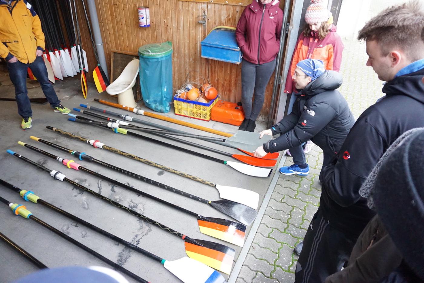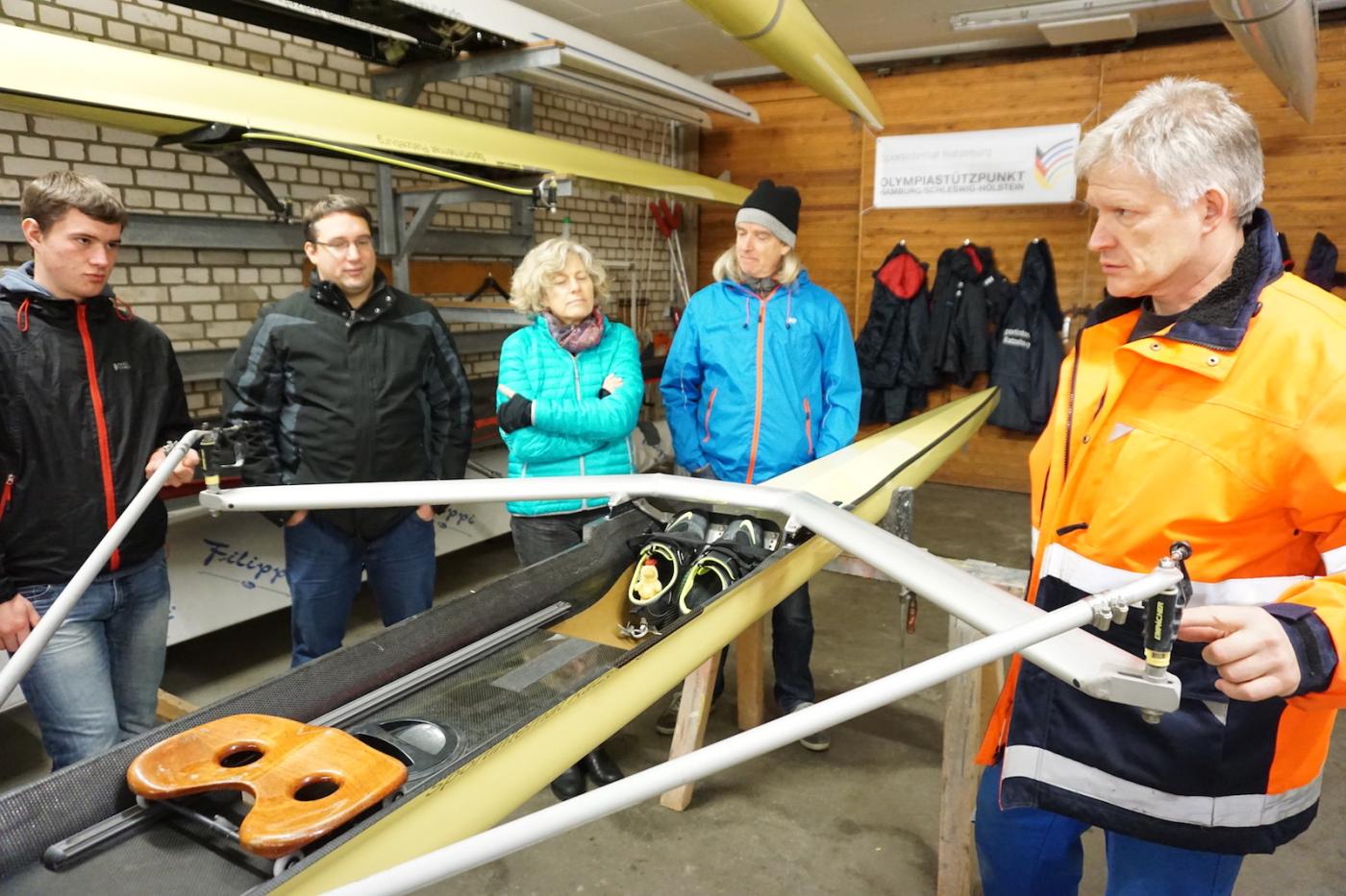 Unser Referent zum Thema Trainingspläne war Marc Swienty, OSP-Trainer am Sportinternat. Einen Trainingsplan als systematische und regelmäßige Vorbereitung für ein gesetztes Ziel zu erstellen, war in dieser Einheit unsere Aufgabe. Durch die sehr unterschiedlich zusammengesetzten Gruppen, konnten wir sehr voneinander profitieren und entwarfen jeweils unter Berücksichtigung der Themen Wasser und Landtraining, zielgruppenspezifische Trainingspläne. Marc ermutigte uns stets eine eigene Meinung zu entwickeln und Hergebrachtes kritisch zu hinterfragen. Auch im Bereich der Hardware ist Marc ein ausgewiesener Experte. Er betreut zusammen mit dem Bootsbaumeister Kay-Uwe Brodersen die Bootsflotte des Internats und Olympiastützpunktes. Kay-Uwe Brodersen gab uns eine kurze Einführung in die fachgerechte Einstellung eines Ruderbootes und stellte die Vor- und Nachteile verschiedener Bootsrisse vor. Marc erläuterte die Entwicklung der Blätter hinsichtlich Material und Form. Nebenbei konnten wir einige „Erlkönige“ im Bereich Rollsitze und Blätter aus dem Hause Empacher anschauen, die hier erprobt werden. Ach ja, Marc näht wunderhübsche Taschen für Ausleger, Boote und Werkzeuge.