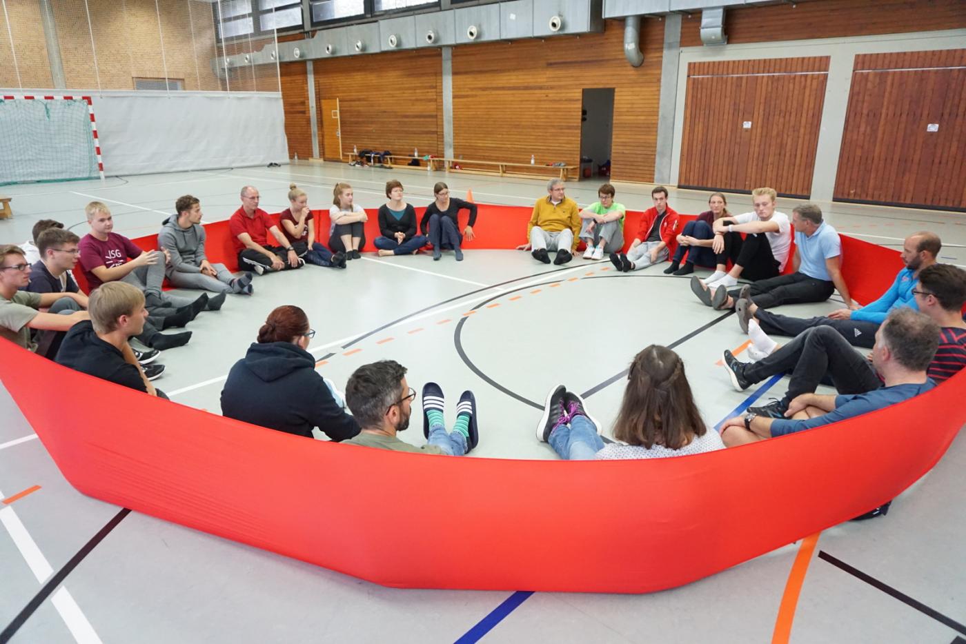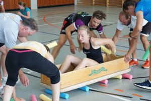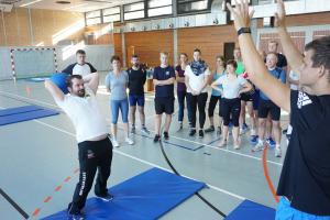 Andreas König führte mit Hilfe des Zirkeltrainings in die Welt des Hallentrainings ein und gab viele Anregungen, entsprechende Sportstunden zu planen. Jede Gruppe erhielt hier den Auftrag, eine Sportstunde (z. B. Stationstraining, Freizeitsportler – Schwerpunkt Koordination und Gleichgewicht mit Ball) zu planen und zu präsentieren. Nach der Präsentation erhielt zunächst die präsentierende Gruppe die Gelegenheit ihr Arbeitsergebnis selbst zu bewerten, sodann die restlichen Seminarteilnehmer/-innen. Abschließend gab Andreas Anregungen zur künftigen Planung und Durchführung derartiger Sportstunden. Sowohl bei den kleinen und großen Ballspielen und auch bei dem eigentlich eher „nüchternen“ Thema Kommunikation schaffte es Andreas immer wieder, allen vor Augen zu führen, das die Teilnehmenden ein tolles Team bildeten.