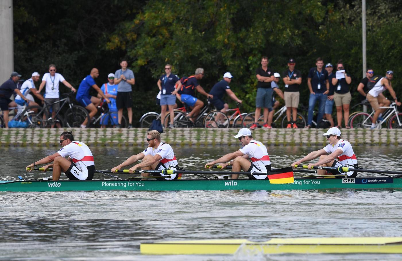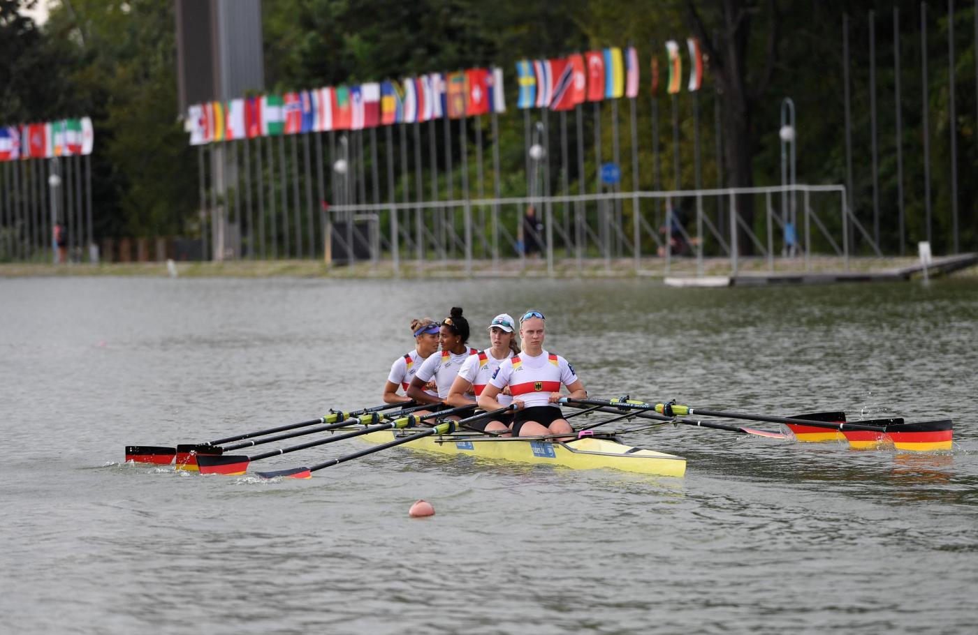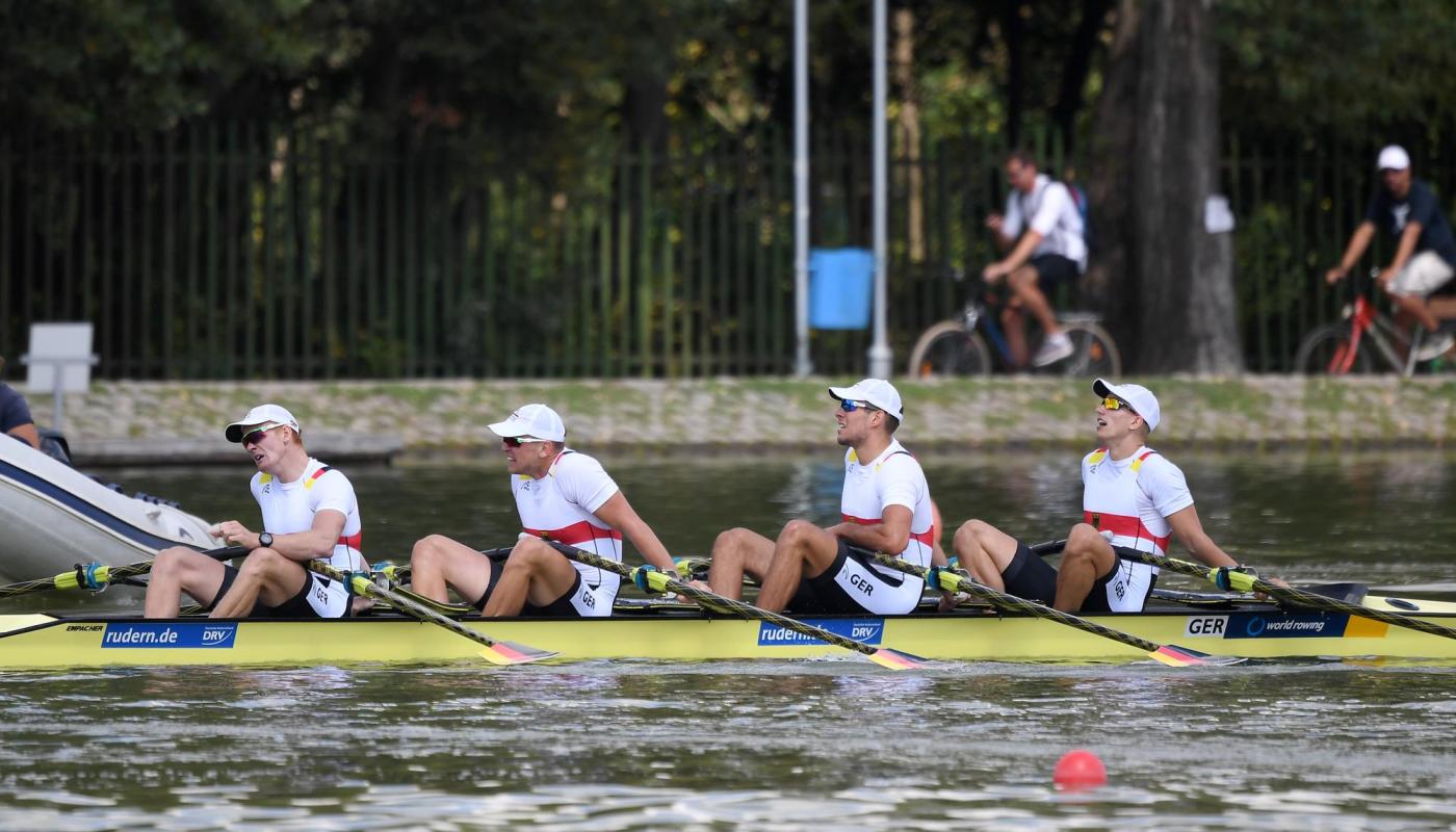 Die erste Goldmedaille für den DRV holte der leichte Männer-Doppelvierer. Zuletzt stand ein deutsches Team 2016 ganz oben auf dem Podium. Florian Roller (Stuttgarter Rudergesellschaft von 1899 e.V.), Moritz Moos (Mainzer Ruder-Verein von 1878 e.V.), Max Röger (Rudergesellschaft Wiking Berlin e.V.) und Joachim Agne (Akademischer Ruderclub Würzburg e.V.) hatten schon mit ihrem Sieg beim Weltcup-Finale in Luzern ihre starke Form unterstrichen. Das Quartett hat sich nach einem gewohnt starken Start direkt an die Spitze des Feldes gesetzt. Nach 500 m lagen sie eine halbe Sekunde vor den Verfolgern aus Italien und Dänemark. Auf der zweiten Teilstrecke erhöhten die Italiener das Tempo, aber die Deutschen wehrten den Angriff erfolgreich ab. Fast zeitgleich gingen die beiden Boote auf die zweite Streckenhälfte, die drittplatzierten Türken hatten fast eine Bootslänge Rückstand. Mit der höchsten Geschwindigkeit gingen die Athleten von Trainer Robert Sens auf die letzten 500 m, konnten sich mit fast einer Bootslänge absetzten und verdient Gold gewinnen. „Wir hätten nicht gedacht, dass es so deutlich wird. Bei 1300 m haben wir gemerkt, dass die Italiener ein wenig in Panik geraten. Auf den letzten 500 m konnten wir dann noch einmal zulegen. Jetzt freuen wir uns natürlich sehr über Gold“, so Florian Roller nach dem Rennen.