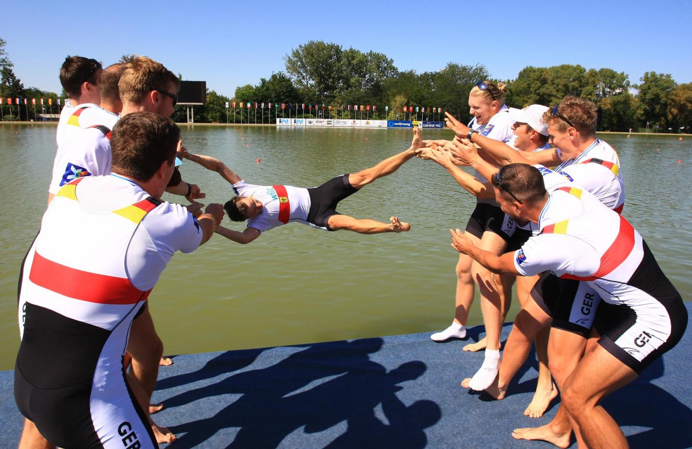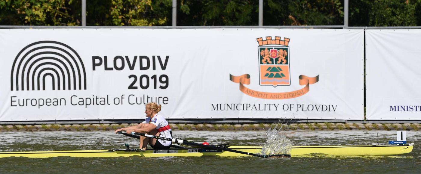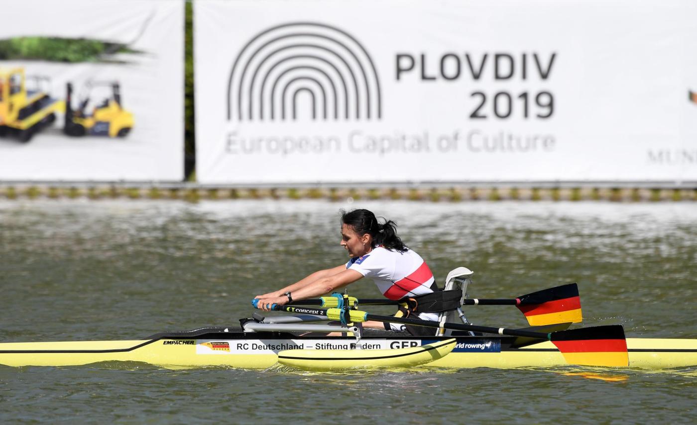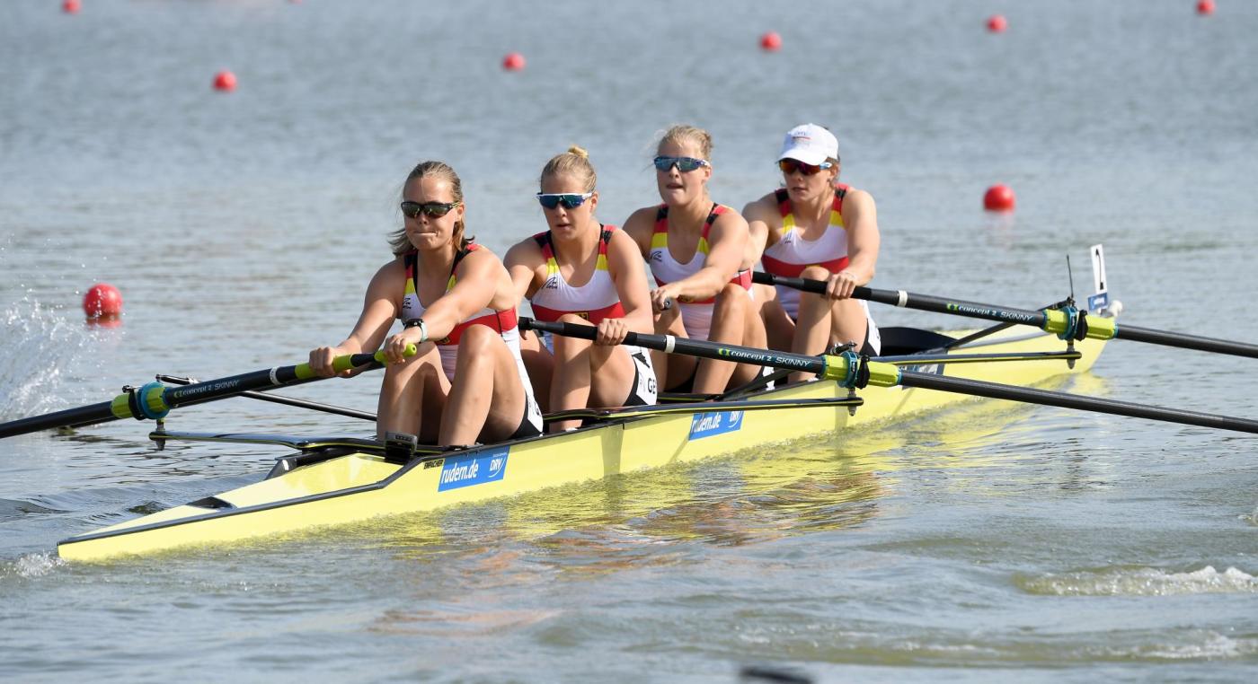 Die erste Goldmedaille für den DRV holte der leichte Männer-Doppelvierer. Zuletzt stand ein deutsches Team 2016 ganz oben auf dem Podium. Florian Roller (Stuttgarter Rudergesellschaft von 1899 e.V.), Moritz Moos (Mainzer Ruder-Verein von 1878 e.V.), Max Röger (Rudergesellschaft Wiking Berlin e.V.) und Joachim Agne (Akademischer Ruderclub Würzburg e.V.) hatten schon mit ihrem Sieg beim Weltcup-Finale in Luzern ihre starke Form unterstrichen. Das Quartett hat sich nach einem gewohnt starken Start direkt an die Spitze des Feldes gesetzt. Nach 500 m lagen sie eine halbe Sekunde vor den Verfolgern aus Italien und Dänemark. Auf der zweiten Teilstrecke erhöhten die Italiener das Tempo, aber die Deutschen wehrten den Angriff erfolgreich ab. Fast zeitgleich gingen die beiden Boote auf die zweite Streckenhälfte, die drittplatzierten Türken hatten fast eine Bootslänge Rückstand. Mit der höchsten Geschwindigkeit gingen die Athleten von Trainer Robert Sens auf die letzten 500 m, konnten sich mit fast einer Bootslänge absetzten und verdient Gold gewinnen. „Wir hätten nicht gedacht, dass es so deutlich wird. Bei 1300 m haben wir gemerkt, dass die Italiener ein wenig in Panik geraten. Auf den letzten 500 m konnten wir dann noch einmal zulegen. Jetzt freuen wir uns natürlich sehr über Gold“, so Florian Roller nach dem Rennen.