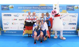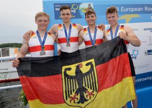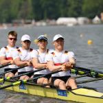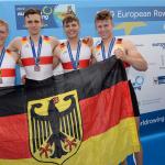 Sören Henkel, Hermann Krüger, Paul Leerkamp und Nils Stutz (RV Waltrop von 1928 e.V./LRV Mecklenburg-Vorpommern von 1990 e.V./ Osnabrücker RV/RV Kappeln im Turn- und Sportverein Kappeln von 1876 e.V.) sind zu Silber im Doppelvierer gerudert. Die Jungs von Trainer Martin Schwave mussten sich nur den neuen Europameistern aus Tschechien geschlagen geben.