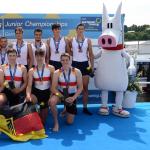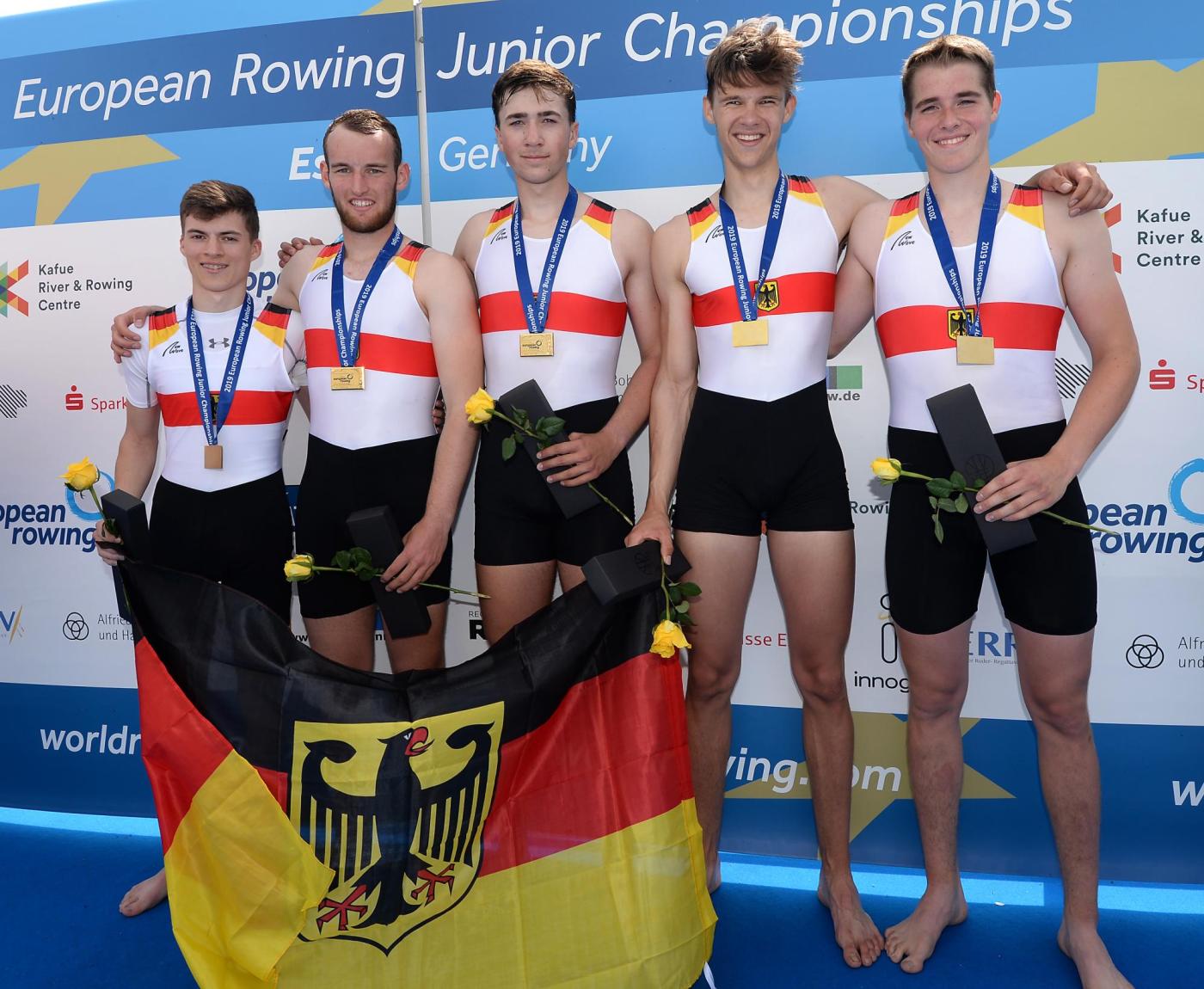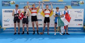 Als goldener Abschluss ruderte der Junioren-Achter zum EM-Titel. Nikita Mohr, Joshua Klaas, Julius Matischik, Mattis Koch, Gero Hensengerth, Erik Kohlbach, Frederik Breuer, Korwin Hildebrandt und Steuermann Julius Fabry (RTHC Bayer Leverkusen /Alster-Ruderverein Hanseat von 1925 e.V./Hürther RG/ Hallesche-Ruder-Vereinigung Böllberg /Bonner RG/RC Hansa von 1898 e.V. Dortmund/Bessel-Ruder-Club e.V.) haben mit einer eindrucksvollen Fahrt der Konkurrenz keine Chance gelassen und die Boote aus Polen und Russland auf die Plätze zwei und drei verwiesen.