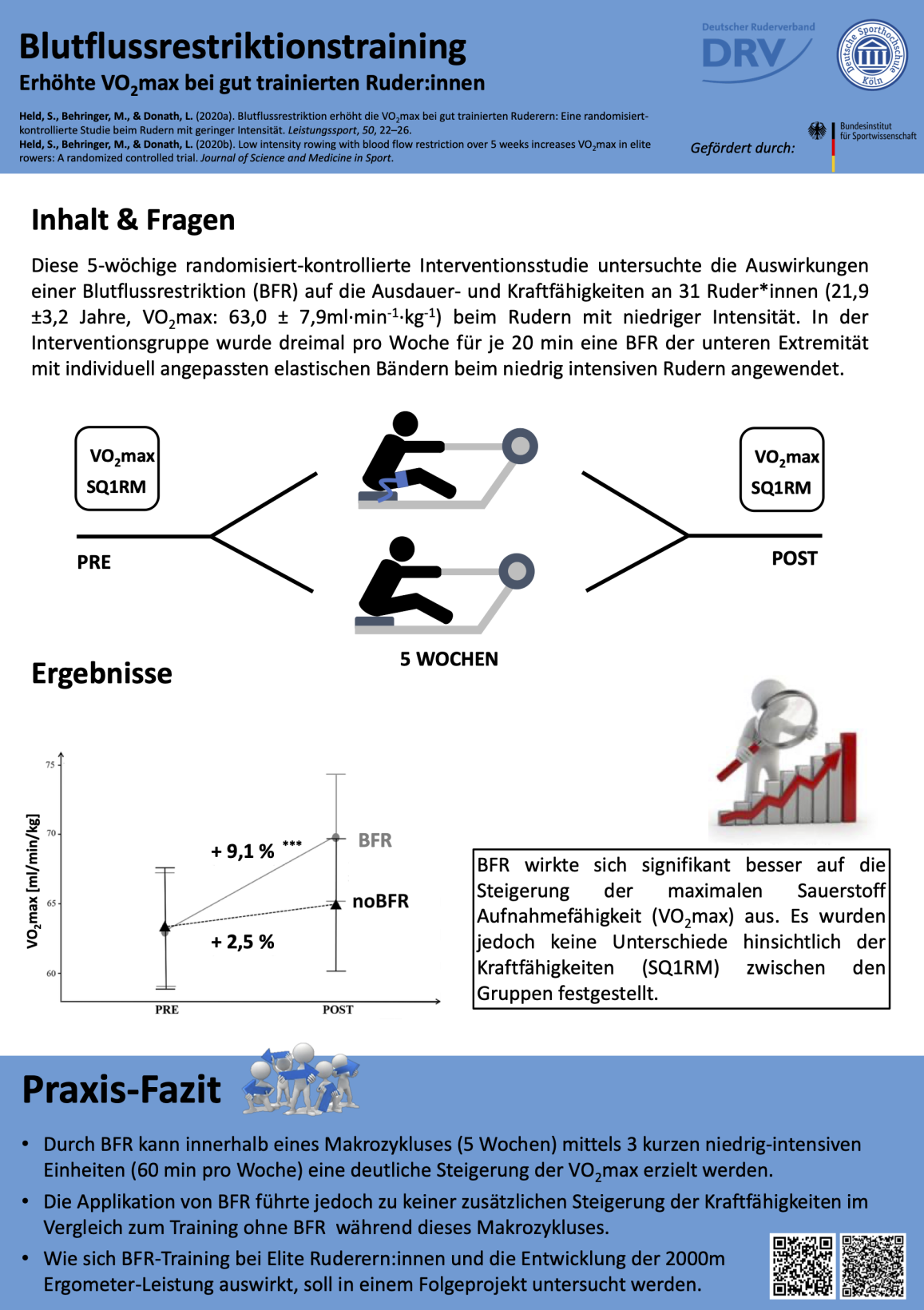 Blutflussrestriktion (BFR) ist eine Trainingsmethode bei der Athleten – üblicherweise während des Krafttrainings - Gummibänder oder aufblasbare Manschetten um Arme oder Beine binden. Durch deren Widerstand wird vor allem der venöse Rückfluss des Blutes aus der Muskulatur vermindert und es kommt u.a. zu einem moderaten lokalen Sauerstoffmangel im Gewebe. Wissenschaftliche Studien und sportpraktische Beobachtungen haben gezeigt, dass sich so die Effektivität des Krafttrainings steigern lässt. Darüber haben sich mittlerweile auch Verbesserungen der Ausdauerleistung durch BFR gezeigt. Unklar war bislang, ob sich BFR im Rudertraining einsetzen lässt und wie es sich auf aerobe Kapazität und Maximalkraftfähigkeit auswirkt.